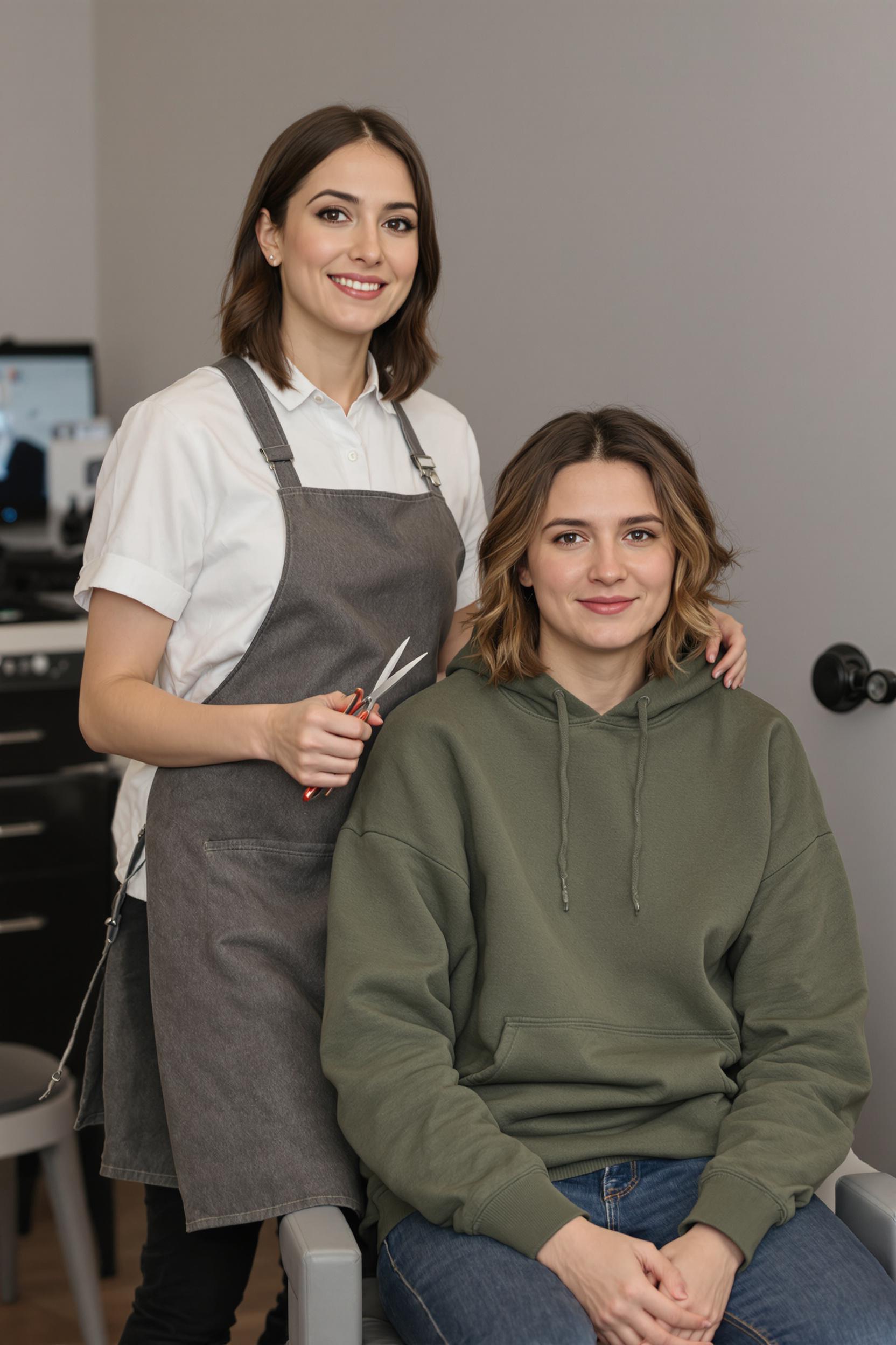 Женщина-парикмахер в стильном черном фартуке поверх блузки и брюк аккуратно держит расческу и фен, второй человек, в повседневной одежде, сидит в парикмахерском кресле, оба смотрят в камеру, на фоне профессиональные инструменты и зеркала.