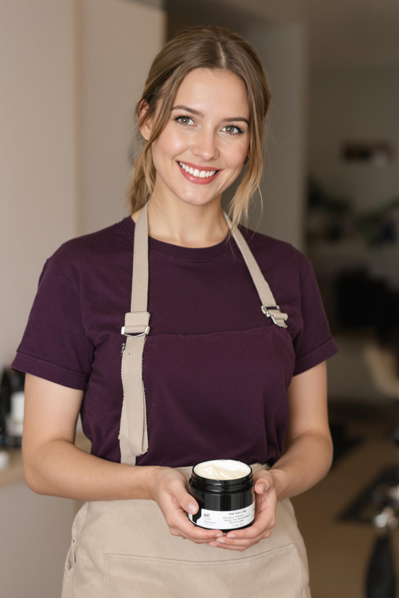 Женщина-парикмахер в темно-фиолетовой футболке и коротком бежевом фартуке на среднем плане уверенно смотрит в камеру, обеими руками держит банку стайлингового крема, минималистичный светлый фон, интерьер салона.