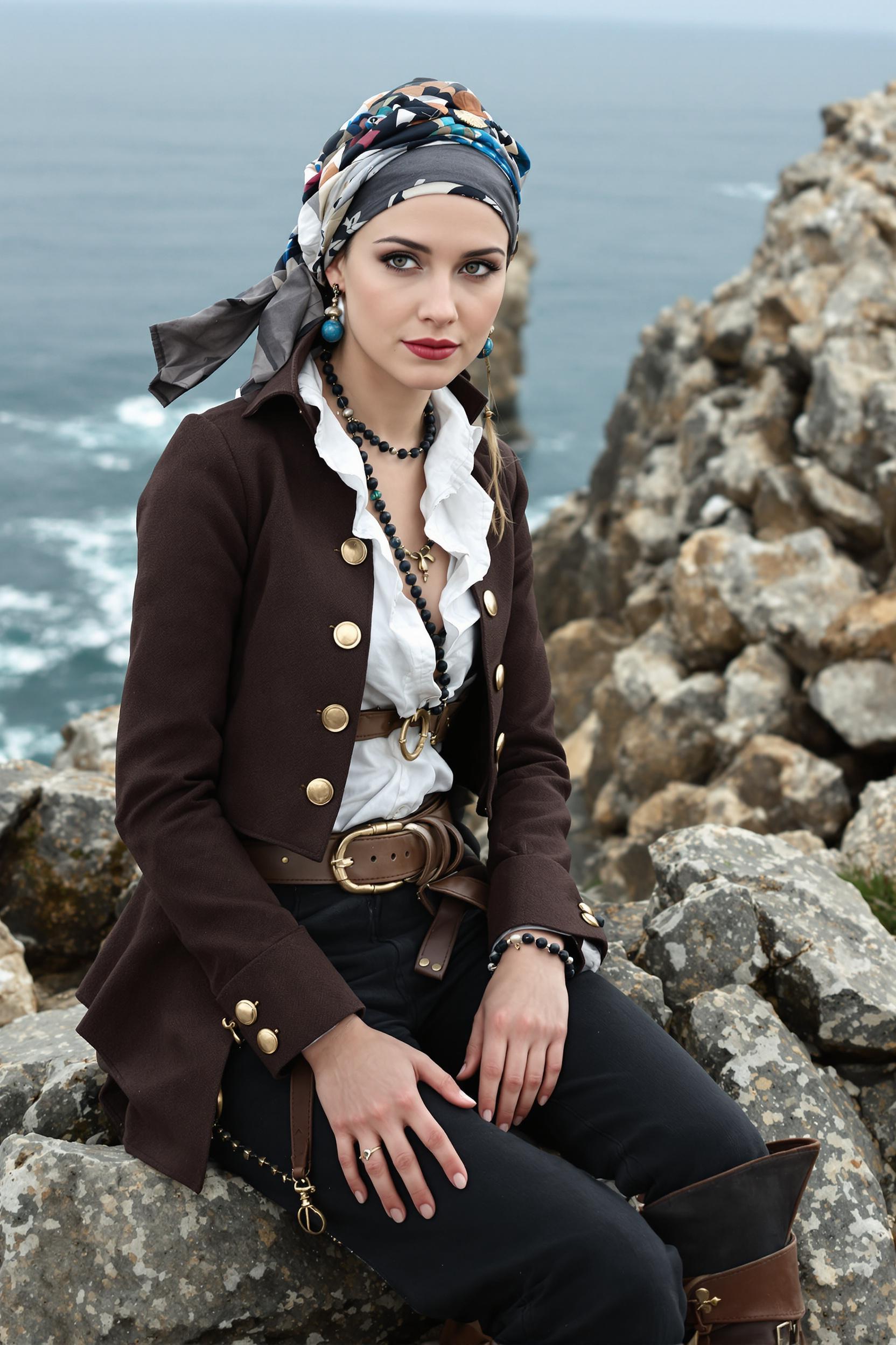 Женщина-пират сидит на утёсе у моря, одета в короткий темно-коричневый жакет с медными пуговицами поверх белой рубахи, чёрные льняные штаны заправлены в грубые ботфорты, кожаный пояс с пряжкой, повязка на голове, украшения из бисера, средний план, прямой взгляд в камеру, вокруг скалы и море.