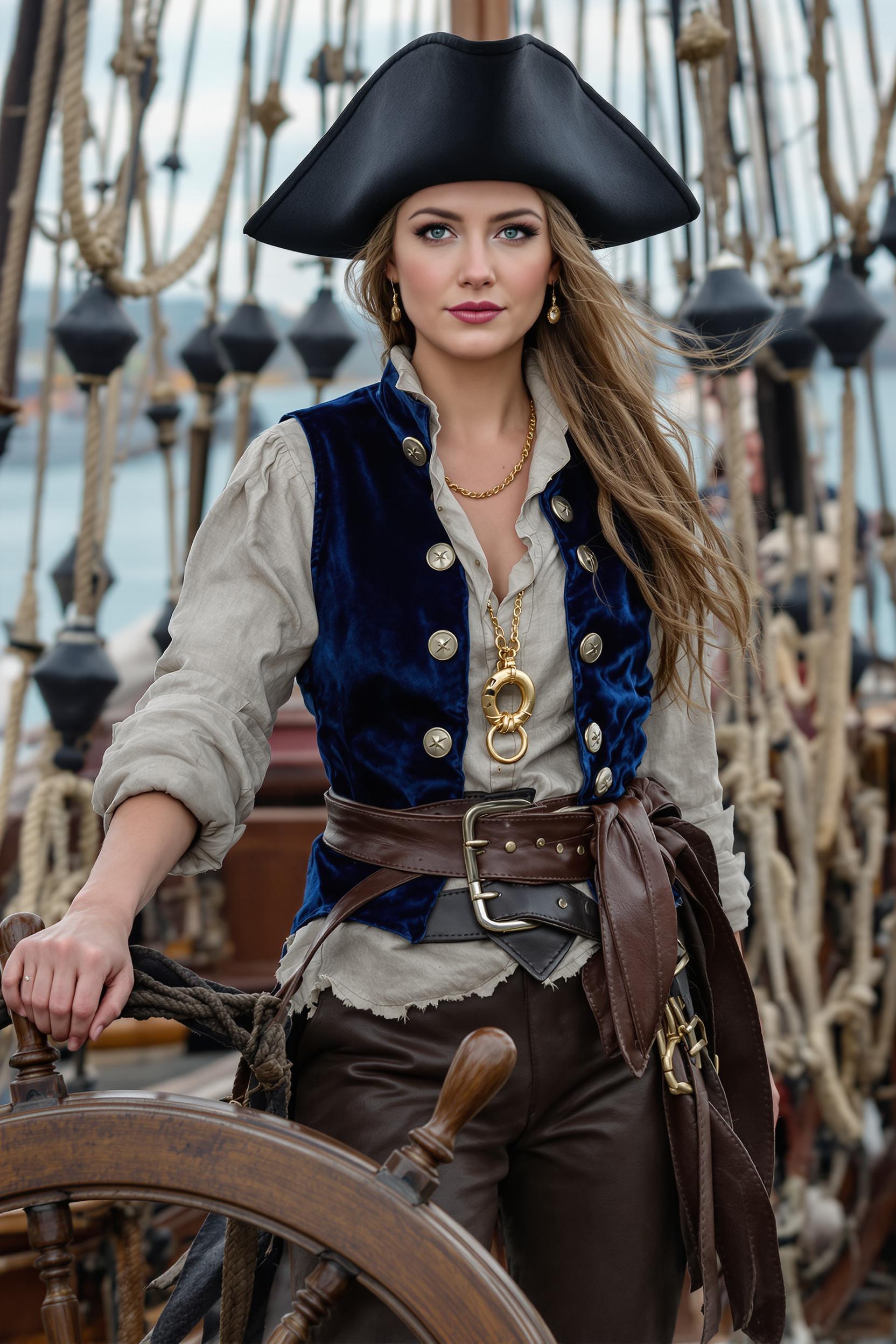 Женщина-пират в тёмно-синем бархатном жилете поверх светлой льняной рубахи, кожаные штаны, сапоги с отворотами, чёрная широкополая шляпа, волосы свободно распущены, золотая цепочка на шее, стоит у штурвала корабля, смотрит в камеру, средний план, морской фон.