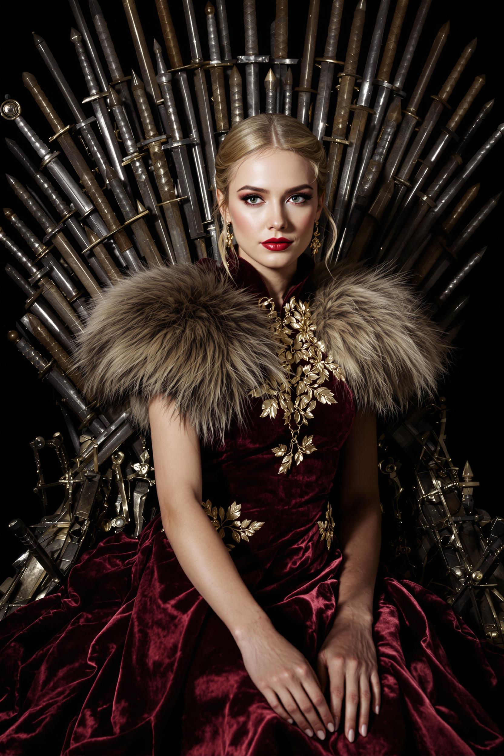 Женщина позирует на фоне массивного трона из мечей, одета в роскошное бархатное платье насыщенного бордового цвета с золотой вышивкой, плечи покрыты коротким плащом из искусственного меха. Женщина уверенно смотрит в камеру, свет контрастный, драматичный.