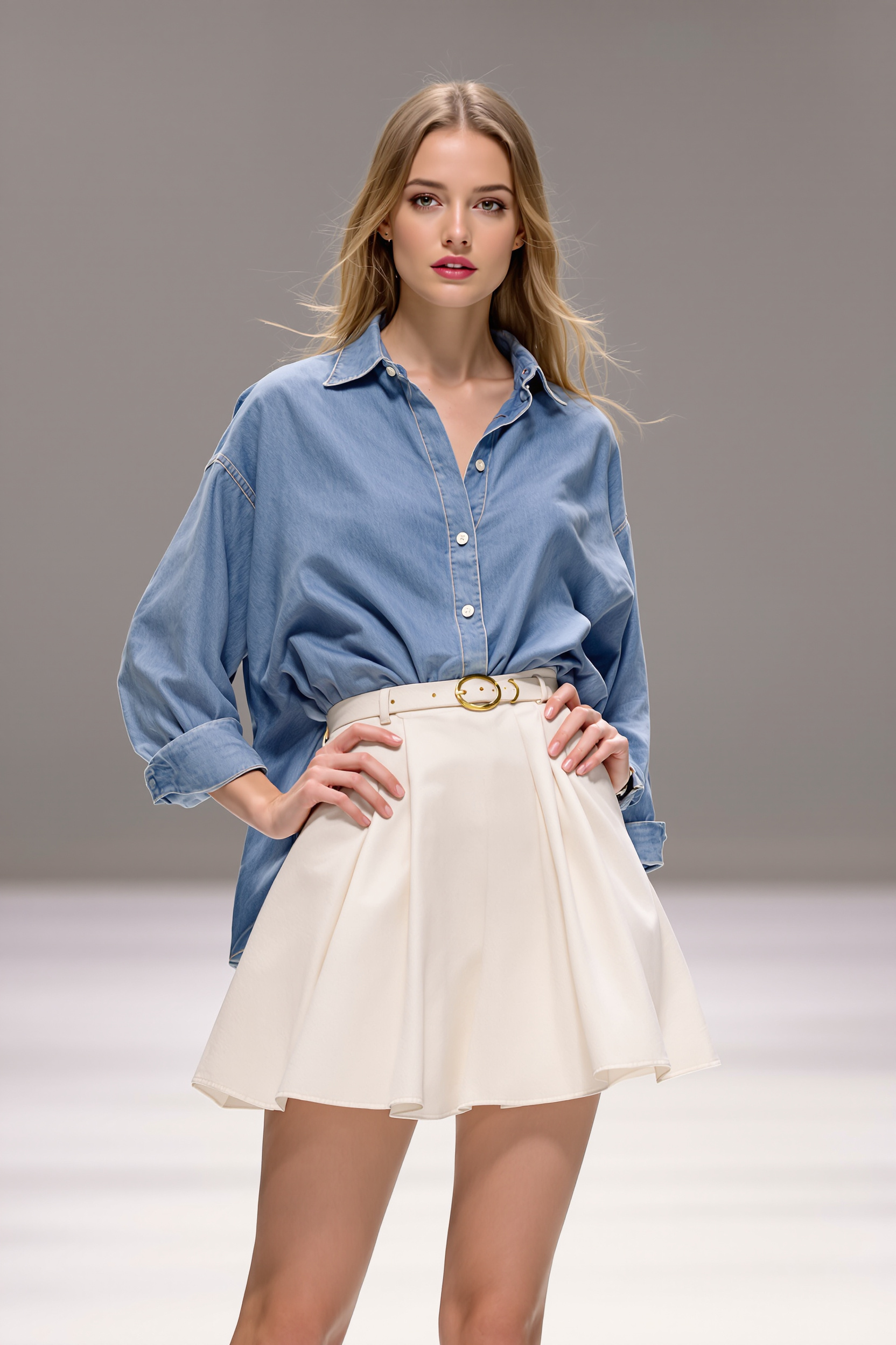 Женщина позирует на подиуме, уверенно смотрит в камеру. На ней короткая светлая юбка-трапеция, заправленная голубая джинсовая рубашка свободного кроя, на талии тонкий ремень. Фон нейтральный, освещение мягкое, средний план.