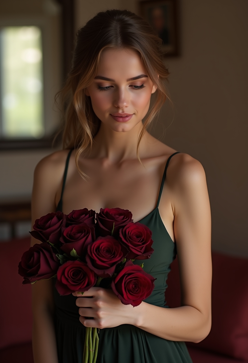 Женщина прижимает к груди букет роз, состоящий из бутонов глубокого винного оттенка. Её взгляд направлен вниз, на губах загадочная улыбка. Позади интерьер с приглушённым освещением, создающий атмосферу интимности. Крупный план, подчёркивающий чувственность сцены.