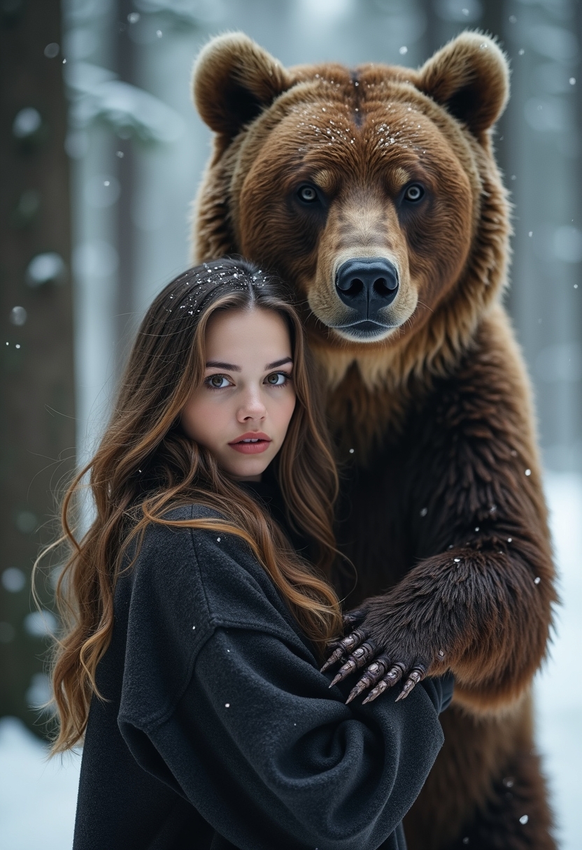 Женщина прижимается к мощной лапе медведя, её взгляд направлен в камеру, губы слегка приоткрыты. Медведь стоит за ней, создавая контраст между её хрупкостью и его массивностью. Позади заснеженный лес, свет рассеивается сквозь снежные хлопья.