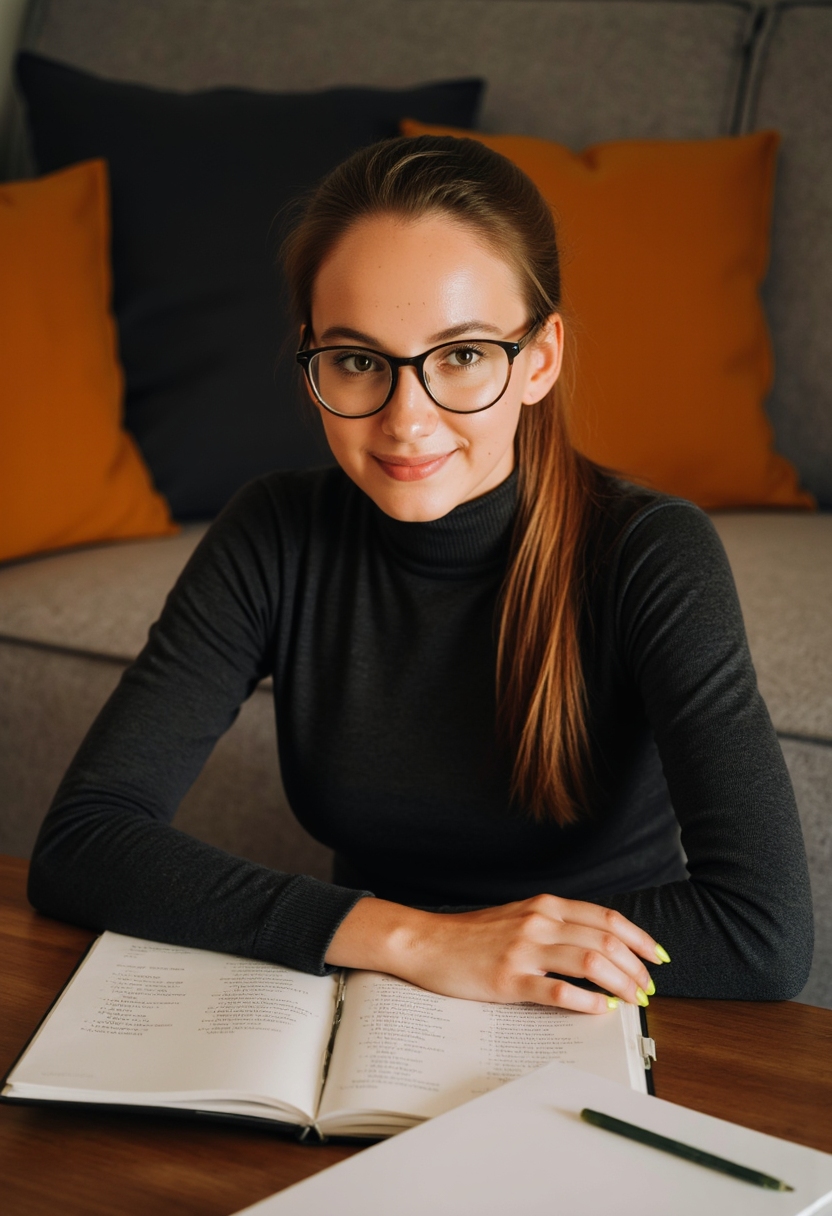 Примерить образ на себеЖенщина-психолог с блокнотом в руках сидит в светлом кабинете, улыбается, смотрит в камеру, позади диван