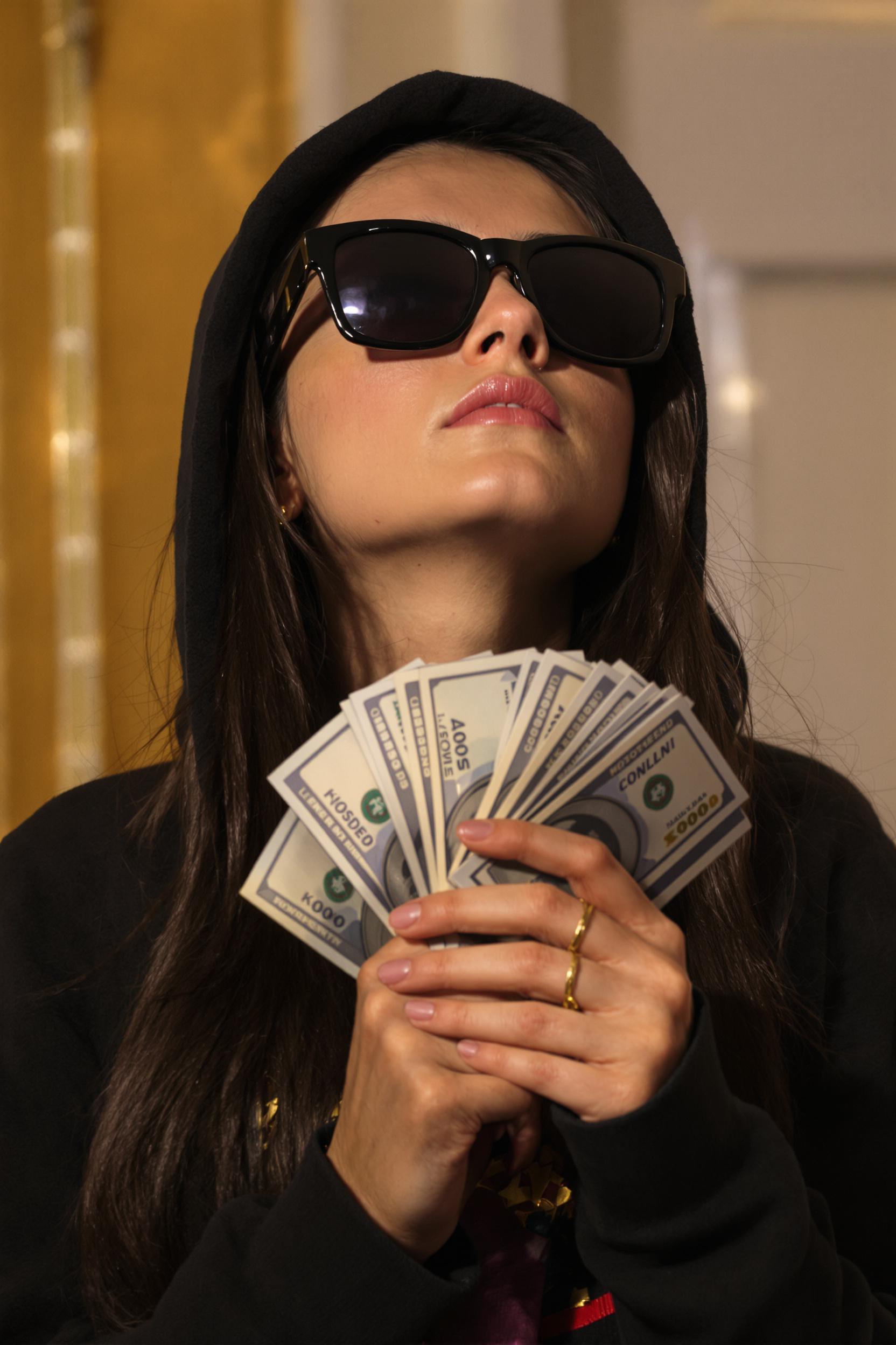 Женщина-рэпер с длинными тёмными волосами в фирменном худи и больших тёмных очках держит в руке пачку денег, взгляд снизу вверх. Крупный план, роскошная атмосфера.
