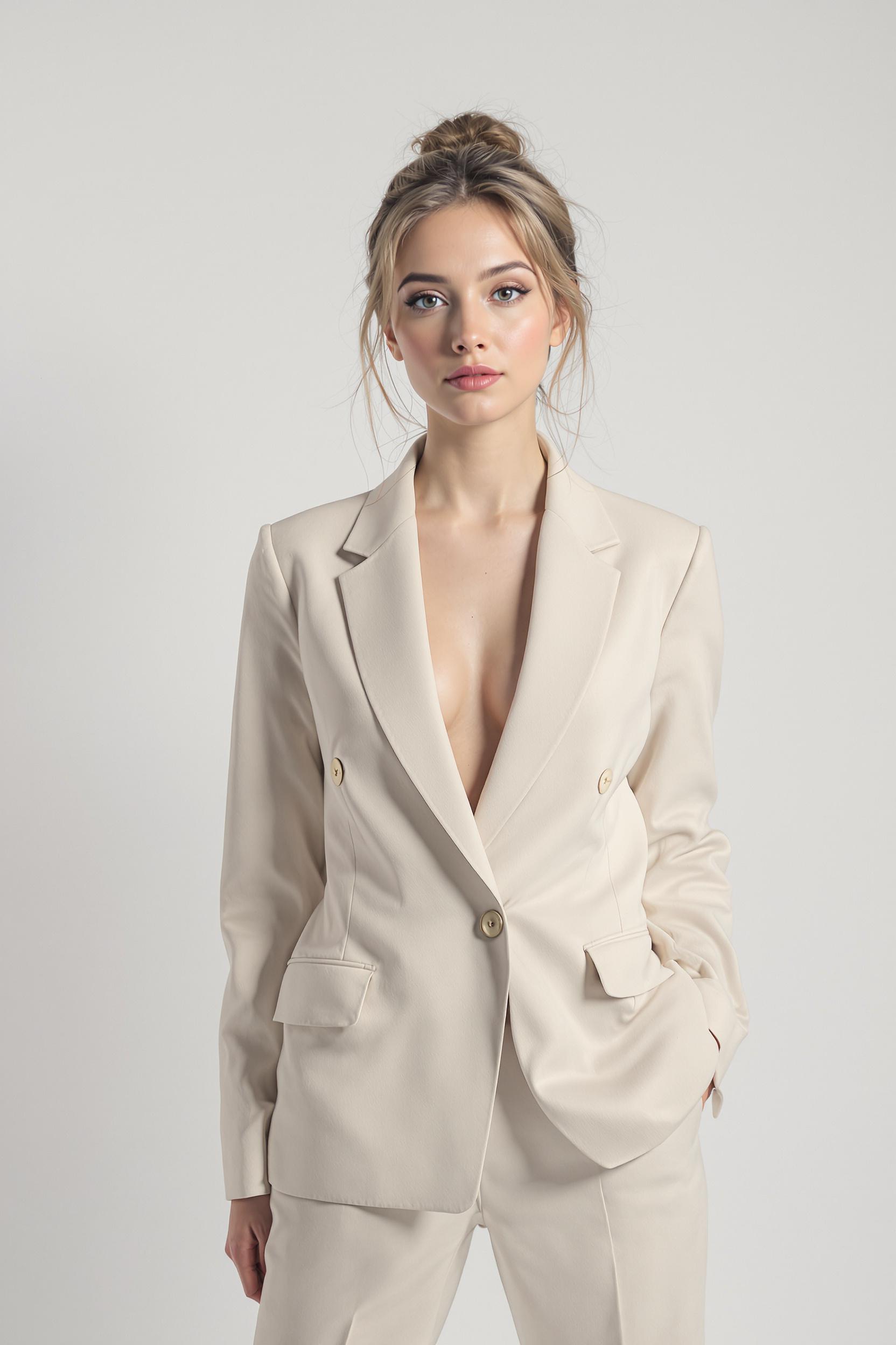 Женщина с аккуратно собранными волосами в минималистичном светлом костюме, стоит на фоне белой циклорамы, средний план, смотрит прямо в камеру, нейтральное выражение лица, мягкий рассеянный свет подчёркивает чистоту студийного пространства.