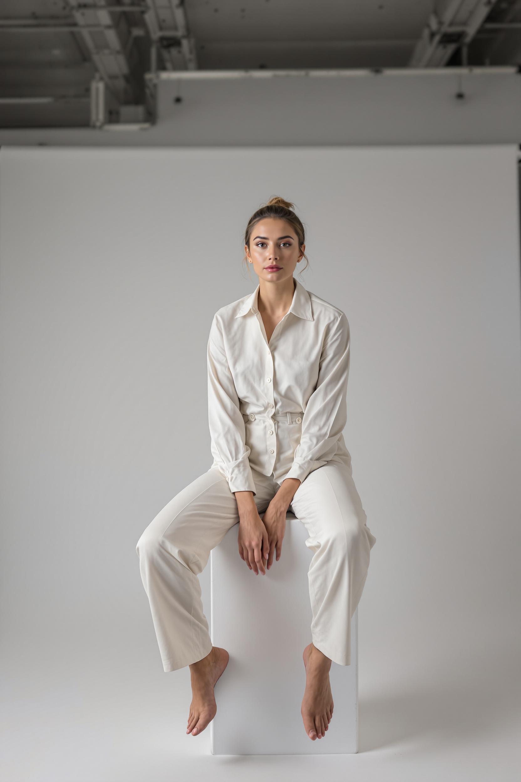 Женщина с аккуратно собранными волосами в молочно-белой лаконичной рубашке и светлых брюках сидит на высоком минималистичном кубе, корпус чуть подан вперёд, руки свободно лежат на коленях, взгляд уверенный и прямой в камеру, фон — белая циклорама, мягкий студийный свет.