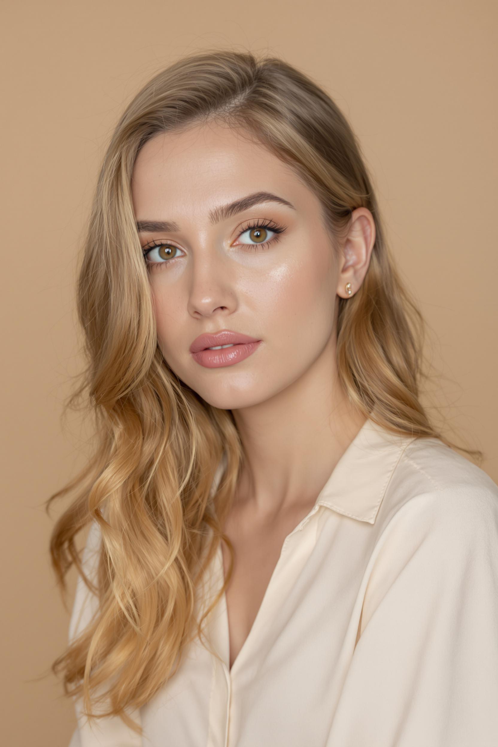Женщина с аккуратным макияжем: матовый тон кожи, едва заметные румяна, чёткие брови, тени в нежной бежево-розовой гамме, губы с увлажняющим прозрачным блеском. Волосы слегка волнистые, распущены. Одетая в кремовую блузу, смотрит прямо в камеру. Фон — бежевая циклорама. Крупный план.