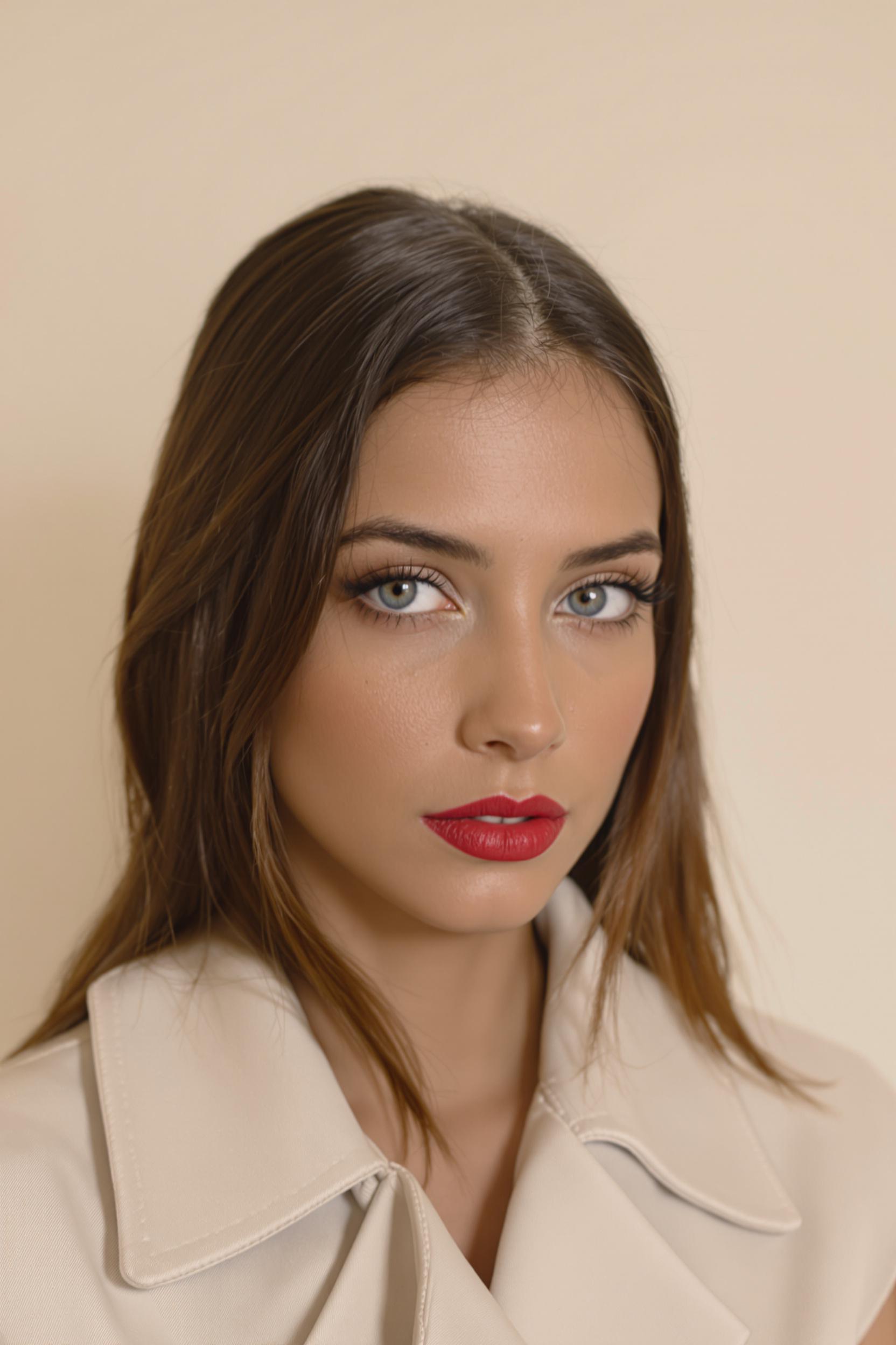 Женщина с бархатистой матовой кожей, пышными алыми губами и выразительным макияжем глаз с длинными ресницами. На ней светло-бежевый жакет без воротника. Прямой взгляд в камеру, крупный план, фон — светлая бежевая циклорама.