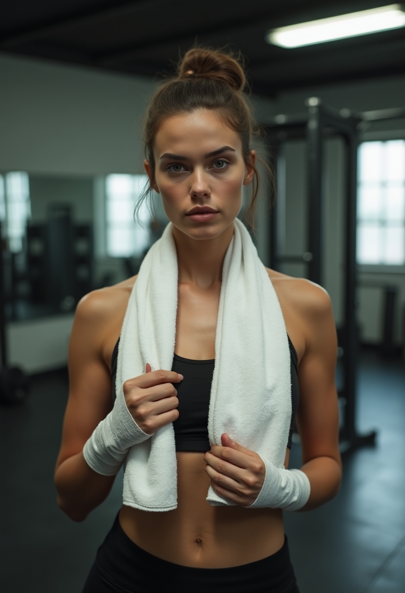 Женщина с бинтами на руках и полотенцем на шее стоит перед зеркалом в спортивном зале, смотрит прямо в камеру