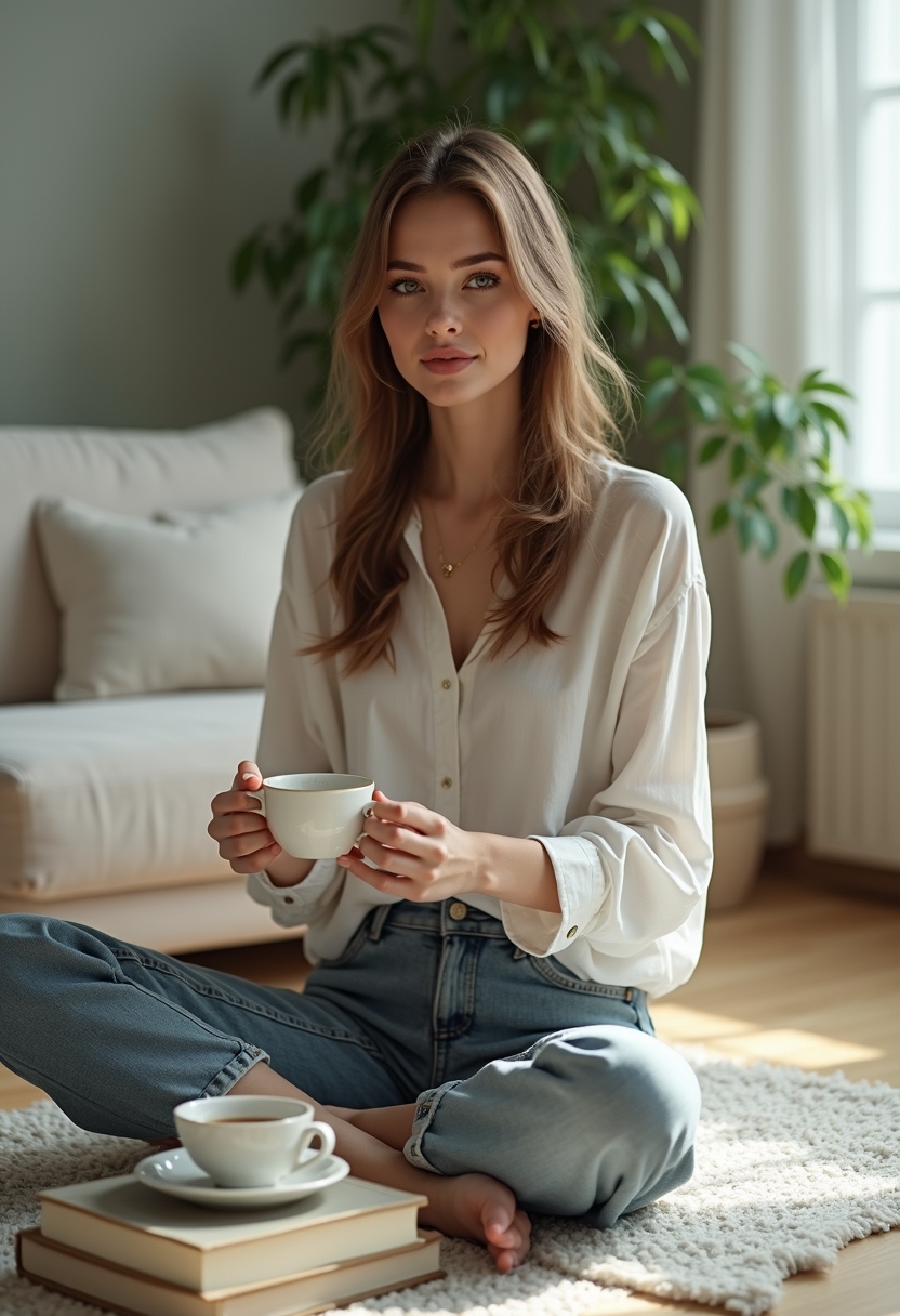 Женщина с чашкой чая сидит на ковре с книгами, смотрит в камеру, позади светлая мебель и зелёные растения