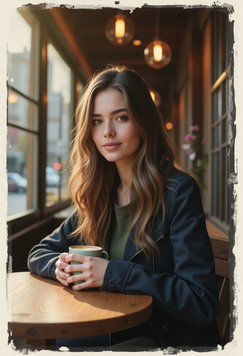 Женщина с чашкой кофе сидит в уличном кафе, вокруг уютная атмосфера и солнечный свет. Фото в стиле Полароид с белой рамкой
