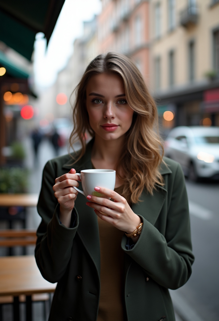 Женщина с чашкой кофе стоит на открытой террасе кафе, смотрит в камеру, позади шумный городской перекрёсток