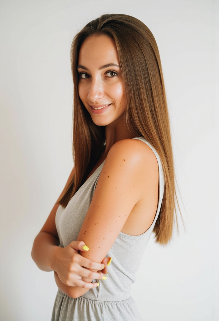 Женщина с длинными распущенными волосами, в светлом платье, на фоне минималистичного белого пространства, смотрит прямо в камеру