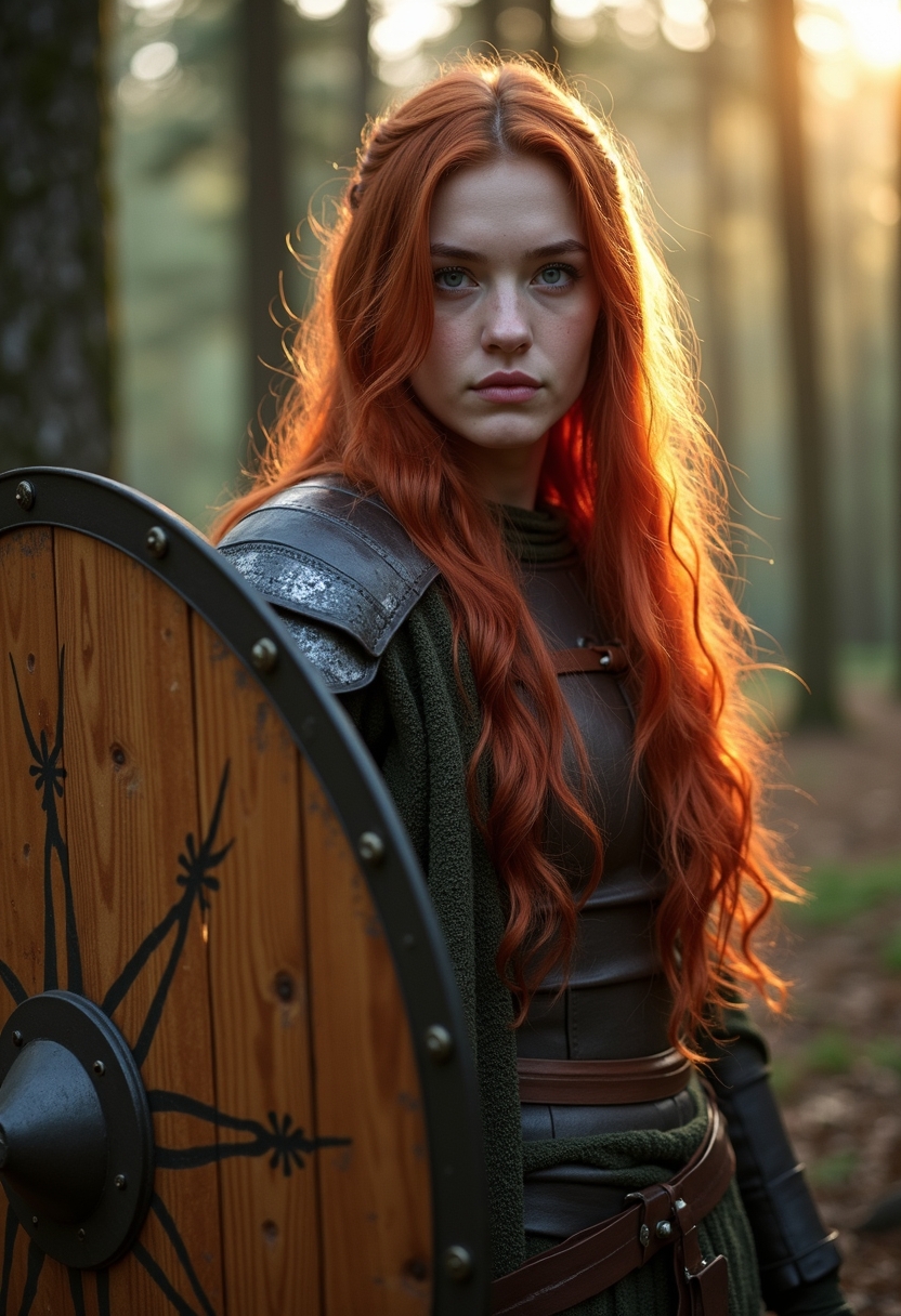 Женщина с длинными рыжими волосами стоит у деревянного щита, на котором выгравированы рунические знаки. Она слегка опирается на него, её взгляд направлен вдаль. Позади лес, сквозь который пробиваются лучи солнца. Крупный план, акцент на текстуре дерева и деталях брони.