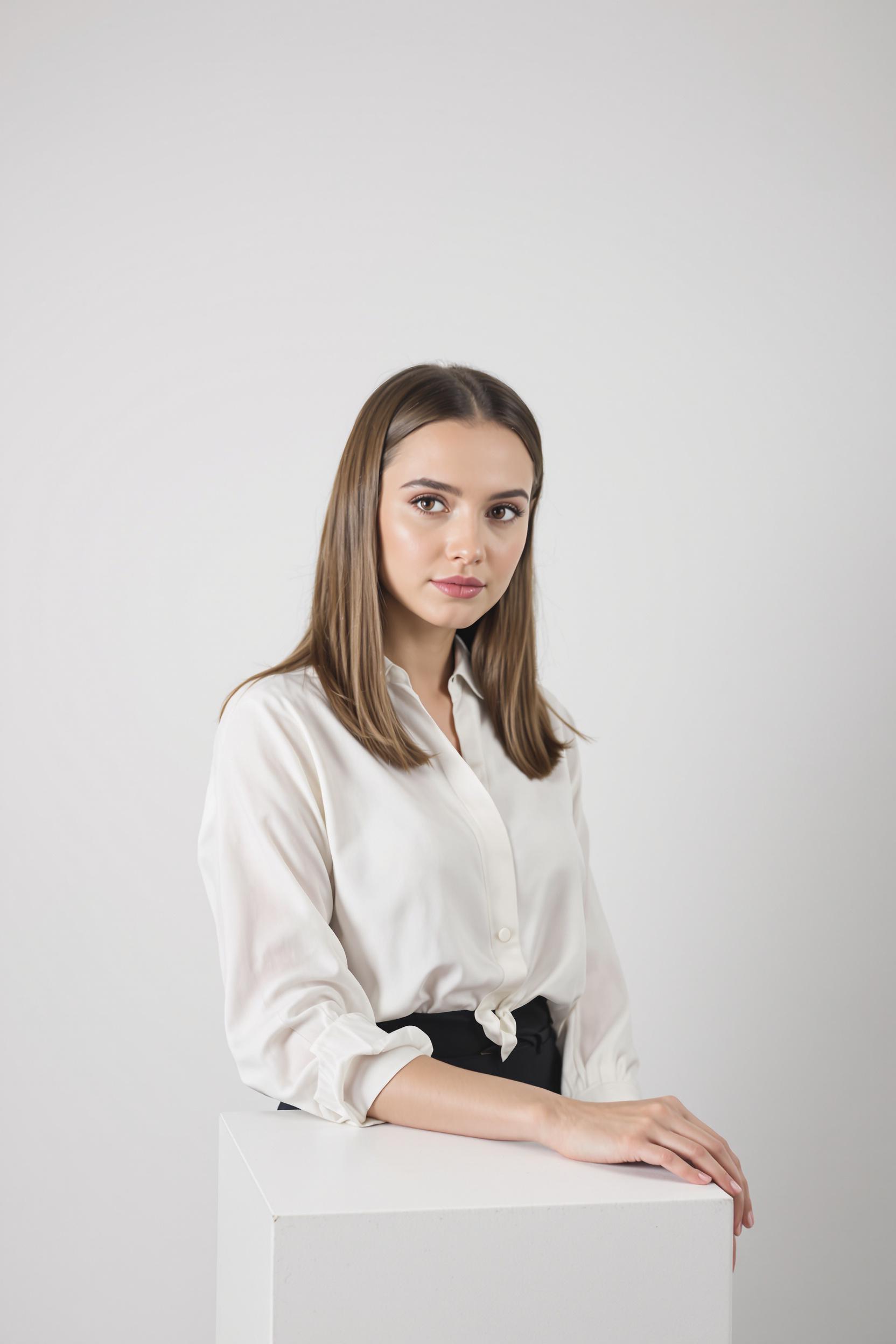 Женщина с гладко зачёсанными волосами в молочно-белой лаконичной блузе стоит у белого геометричного куба, опирается на него одной рукой. Средний план, взгляд прямо в камеру, вокруг — чистое пространство циклорамы, минимализм и мягкий студийный свет.