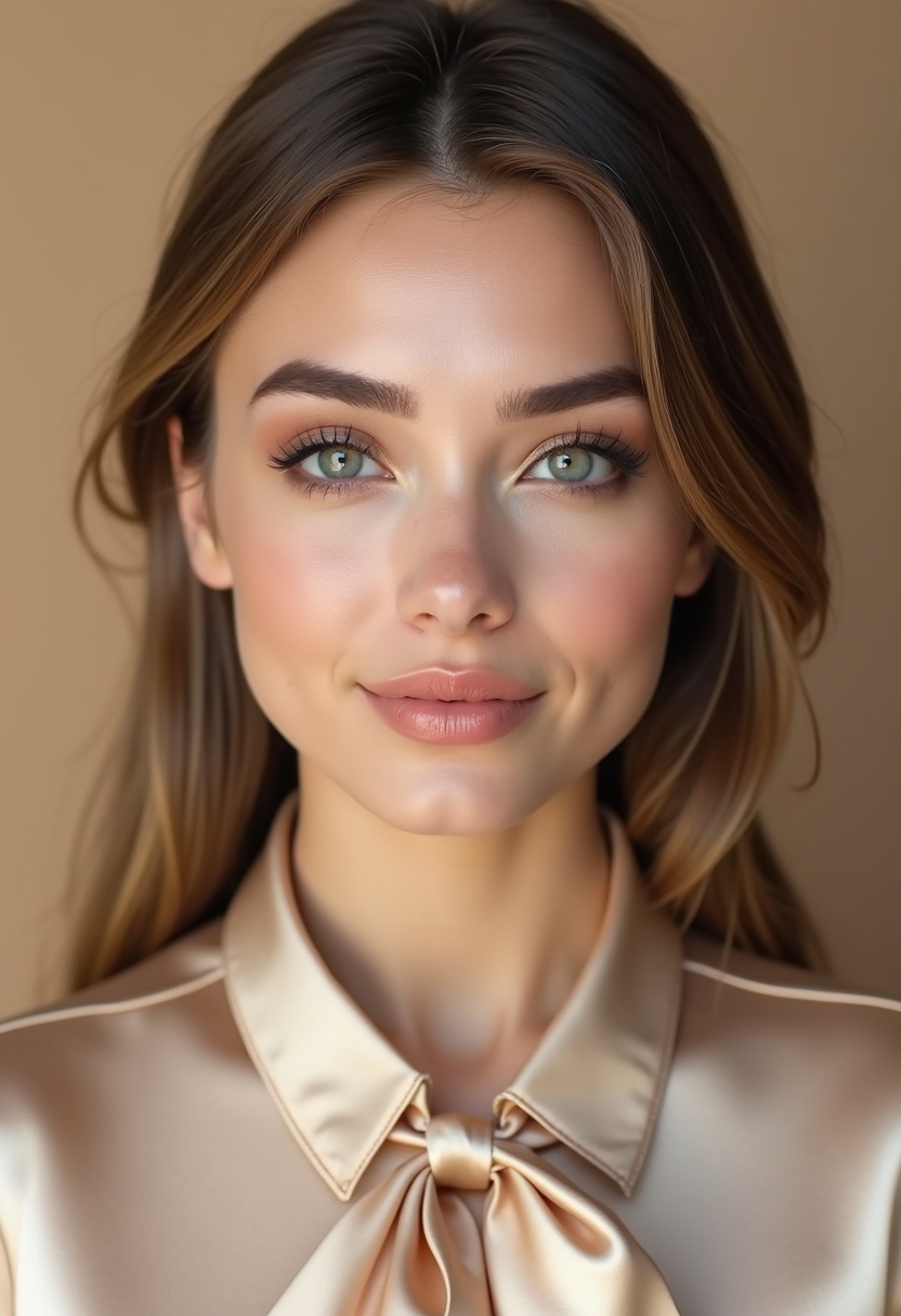 Женщина с идеально прорисованными густыми бровями, мягким smoky eyes в серо-бежевых тонах и губами нежного бежево-персикового оттенка. Её одежда — шёлковая блуза бежевого оттенка с бантом у воротника. Фон — бежевая циклорама, идеально сочетающаяся с оттенками её профессионального макияжа.