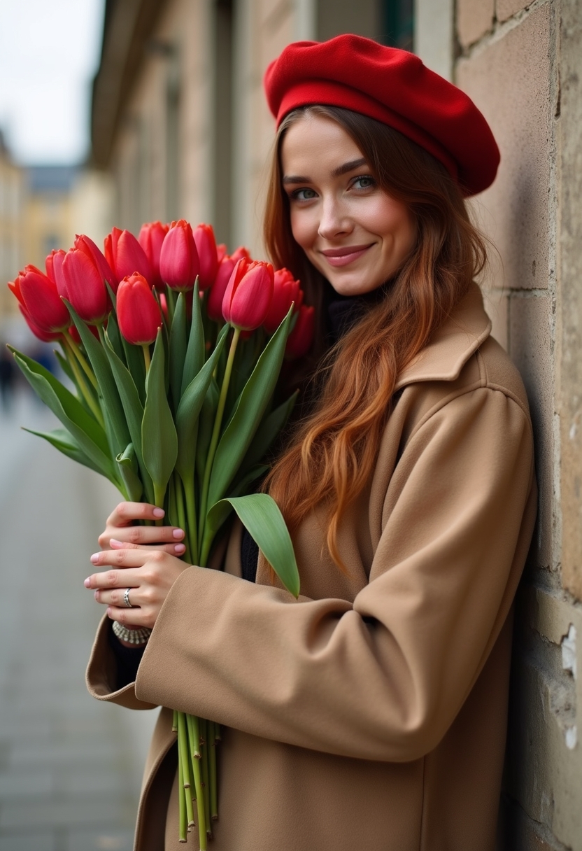 Женщина с каштановыми длинными волосами в песочном кашемировом оверсайз-пальто держит большой букет красных тюльпанов возле лица. Носит красный берет. Прислонилась к стене старинного здания.