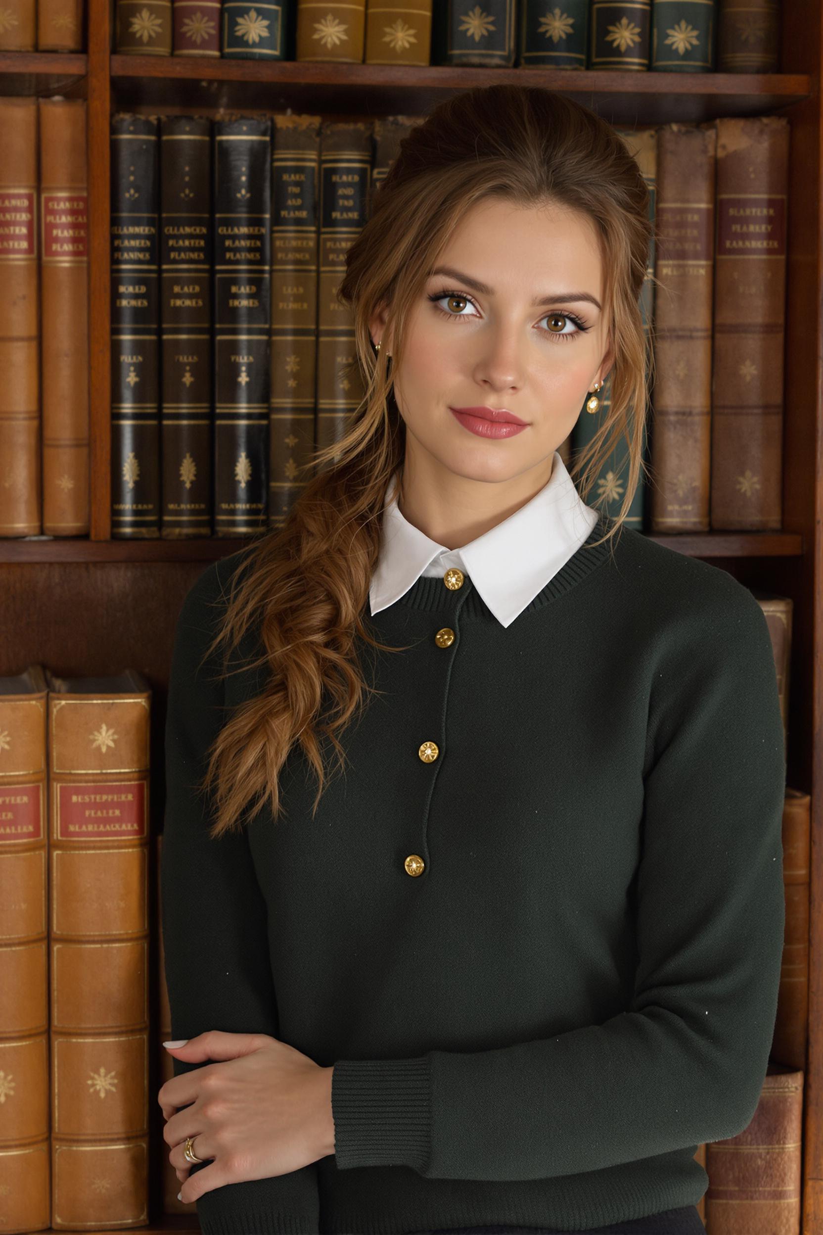 Женщина с каштановыми волнистыми волосами, собранными в низкий хвост, позирует у книжного шкафа, заполненного старыми кожаными томами. Она одета в темно-зеленый свитер с белым отложным воротником и небольшими золотыми пуговицами. Взгляд прямо в камеру.