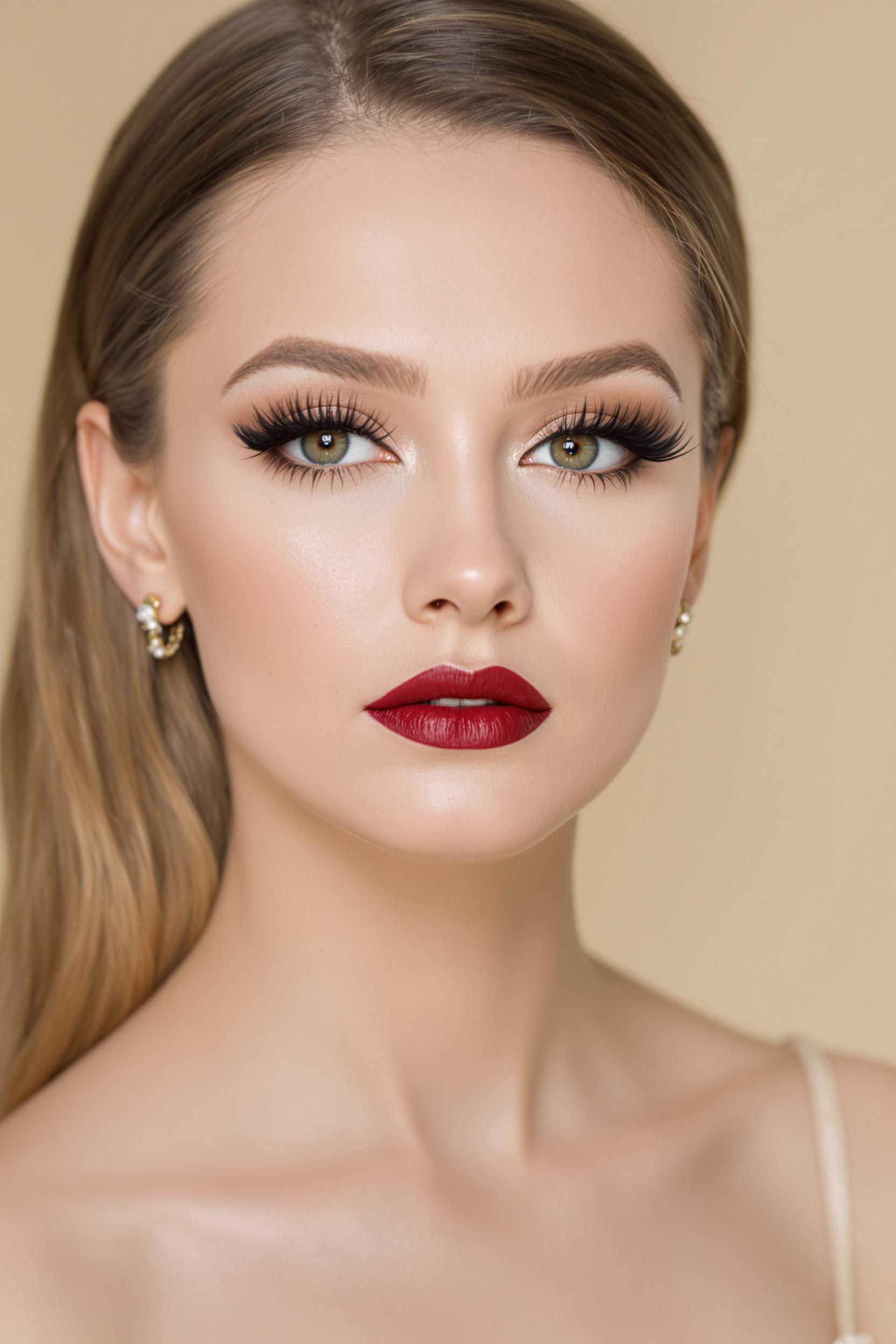 Женщина с классическим голливудским макияжем: фарфоровая матовая кожа, выразительные стрелки, роскошные объёмные ресницы, яркая винная помада. Волосы собраны гладко. Крупный план, взгляд прямо в объектив, светлая бежевая циклорама на фоне.