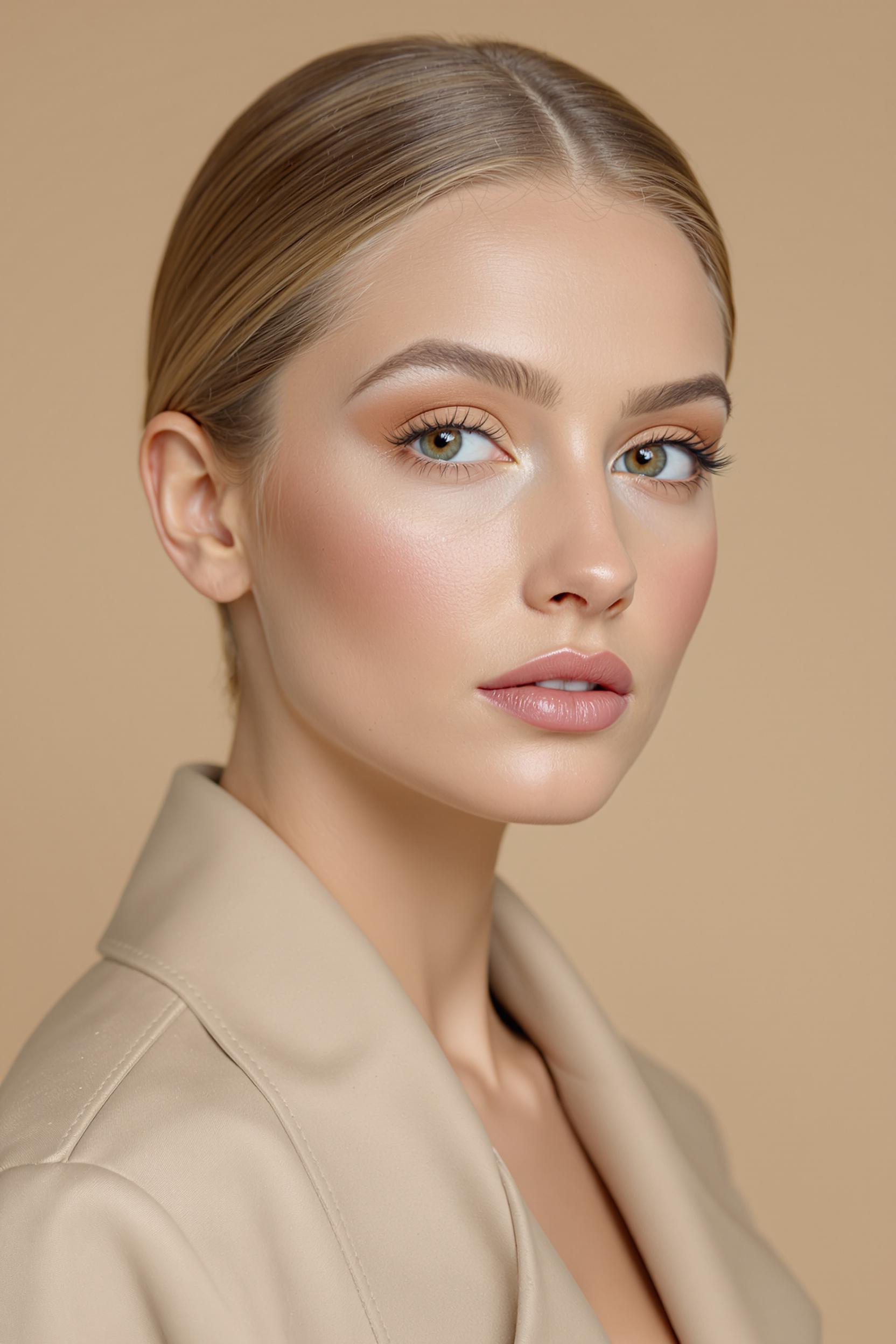 Женщина с идеально оформленным влажным сияющим макияжем: кожа свежая и светится, глаза подчёркнуты нюдовыми тенями и натуральными ресницами, губы полупрозрачные, розово-бежевые. Волосы гладко зачёсаны, на ней бежевый oversize жакет. Крупный план, прямой взгляд, фон — бежевая циклорама.