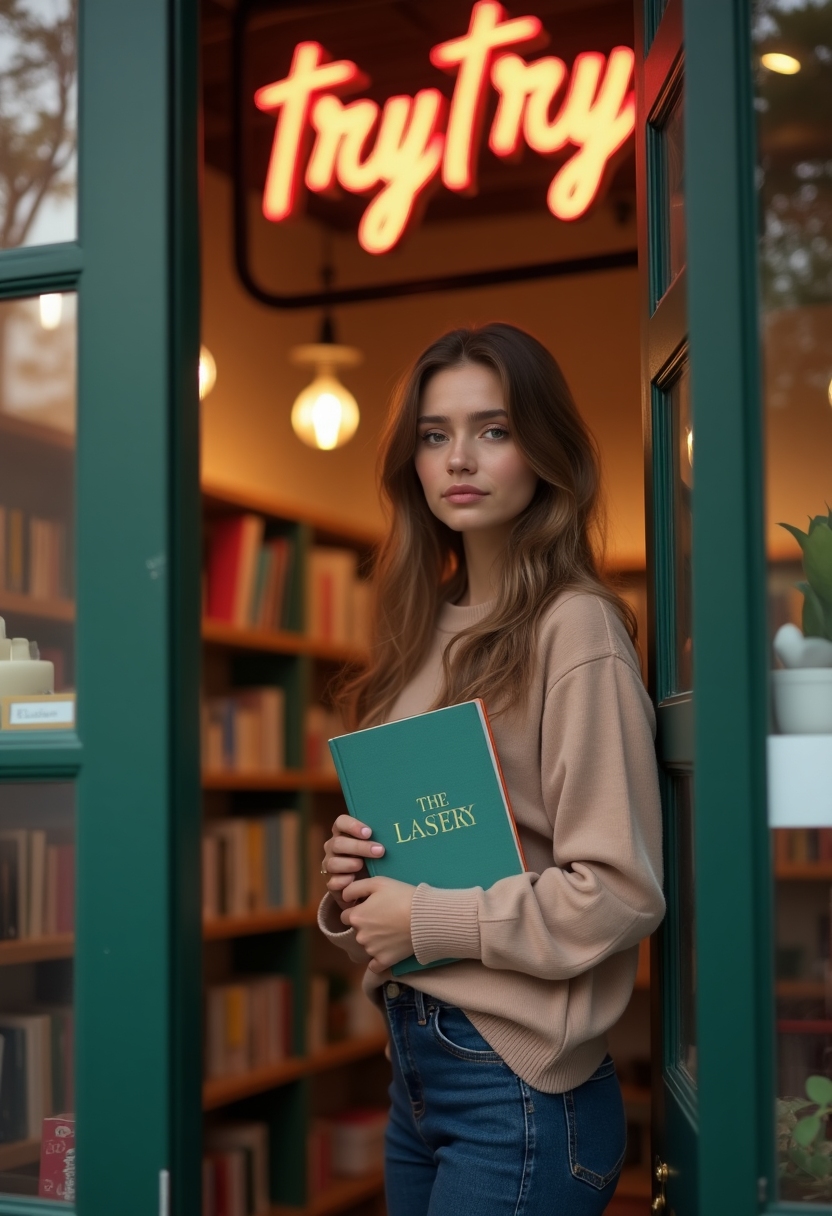 Женщина с книгой в руках стоит у входа в литературный магазин, за спиной яркая вывеска, смотрит прямо в камеру