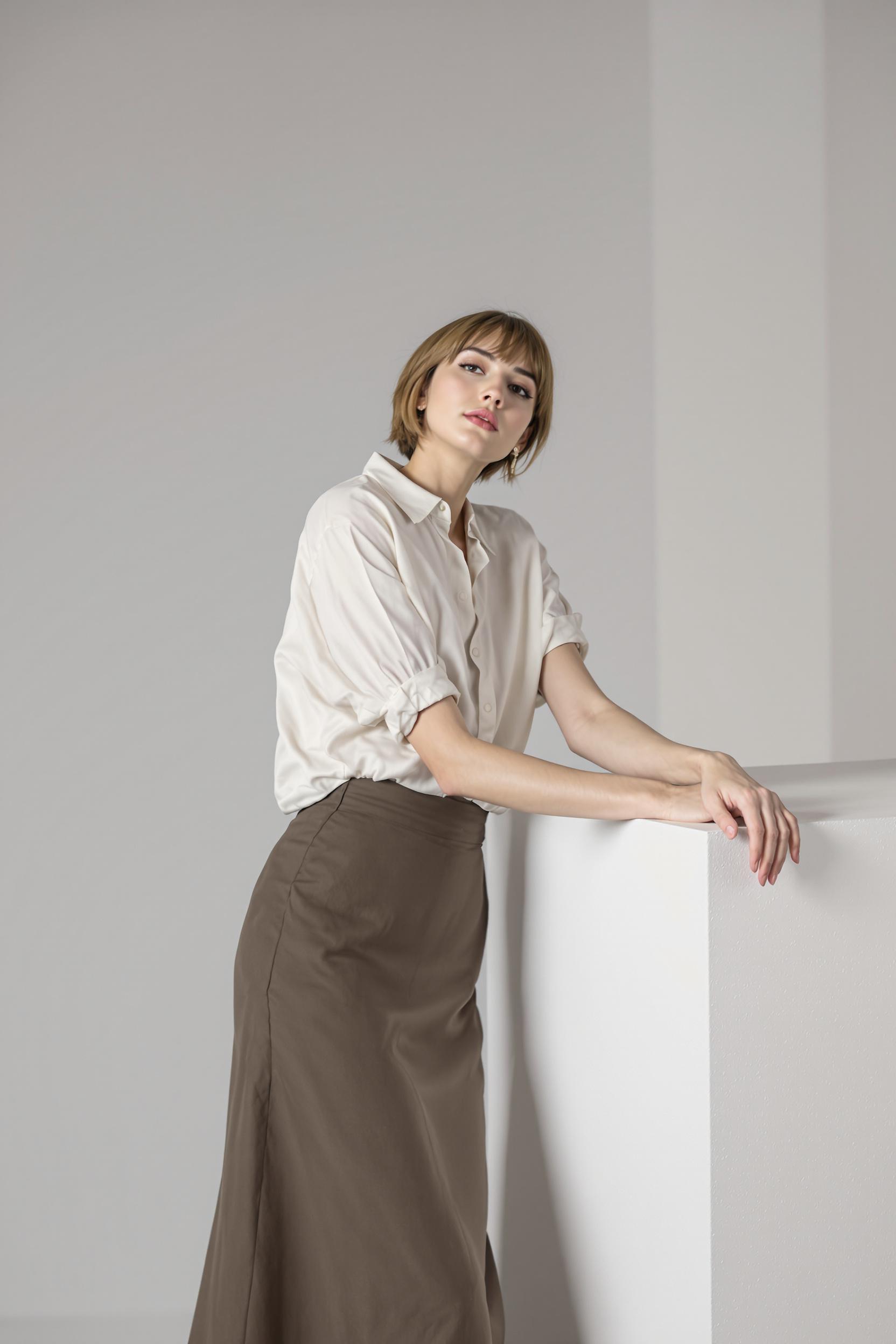 Женщина с короткими каштановыми волосами в лаконичной светлой блузе и прямой юбке, стоит полубоком у низкого белого куба, слегка опираясь на него локтем, средний план, уверенный взгляд в камеру, вокруг минималистичная белая циклорама, мягкий свет.