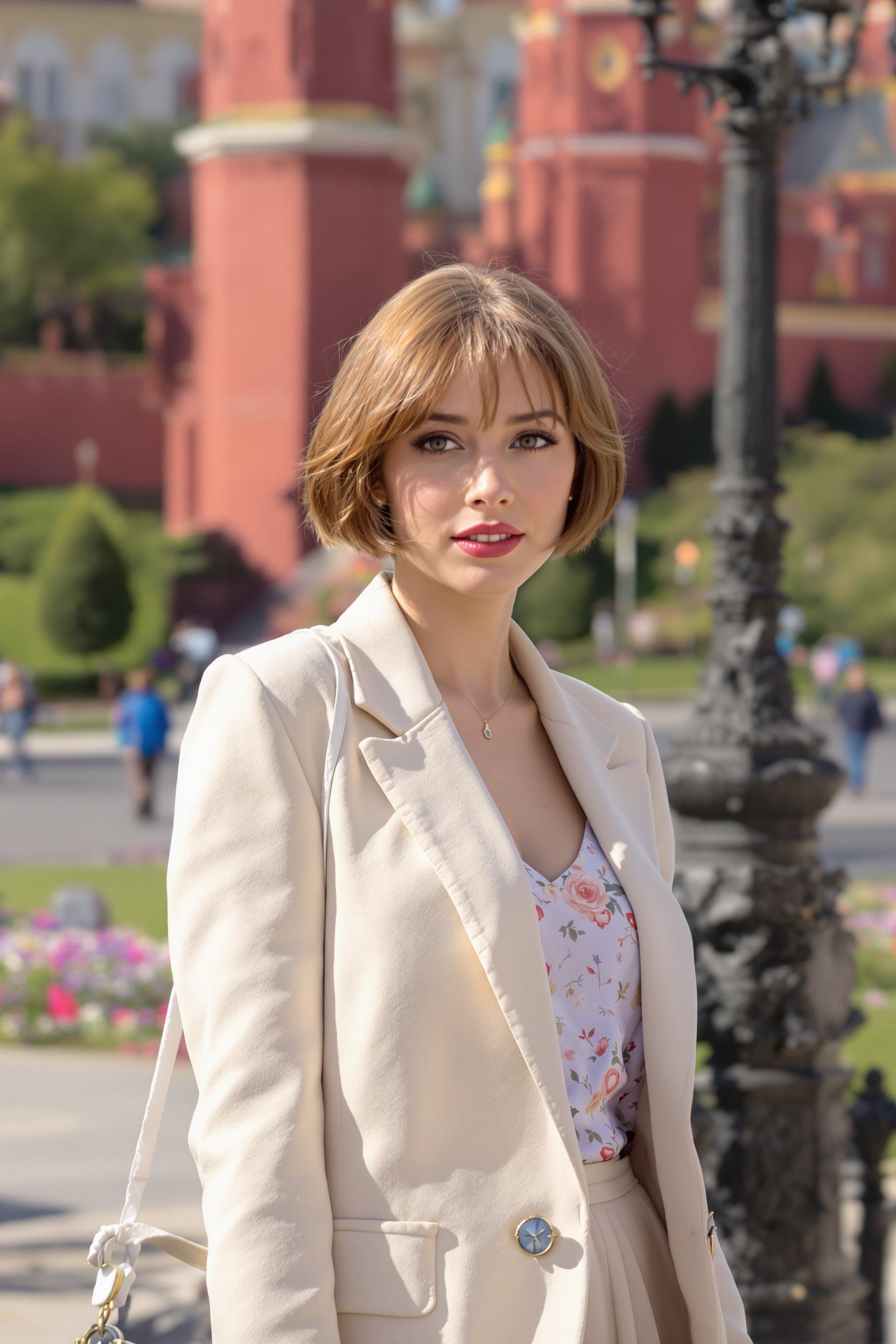 Женщина с короткими каштановыми волосами в светлом пиджаке и воздушной юбке стоит на Красной площади, на заднем плане стены Кремля и зелёные газоны, она уверенно смотрит прямо в камеру, свежий весенний день, лёгкий солнечный свет.