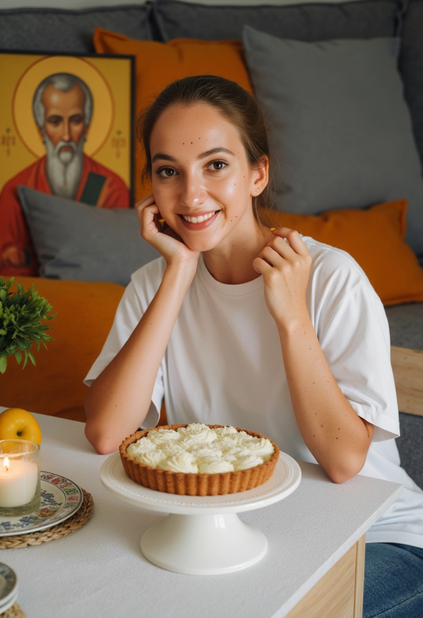 Женщина с нежной улыбкой сидит за столом, перед ней пасхальный пирог с белой глазурью и свечой. Она аккуратно поправляет скатерть, её взгляд направлен в камеру. Позади пасхальная икона и традиционные русские узоры на посуде. Крупный план, подчёркивающий уют и традиции православного праздника.