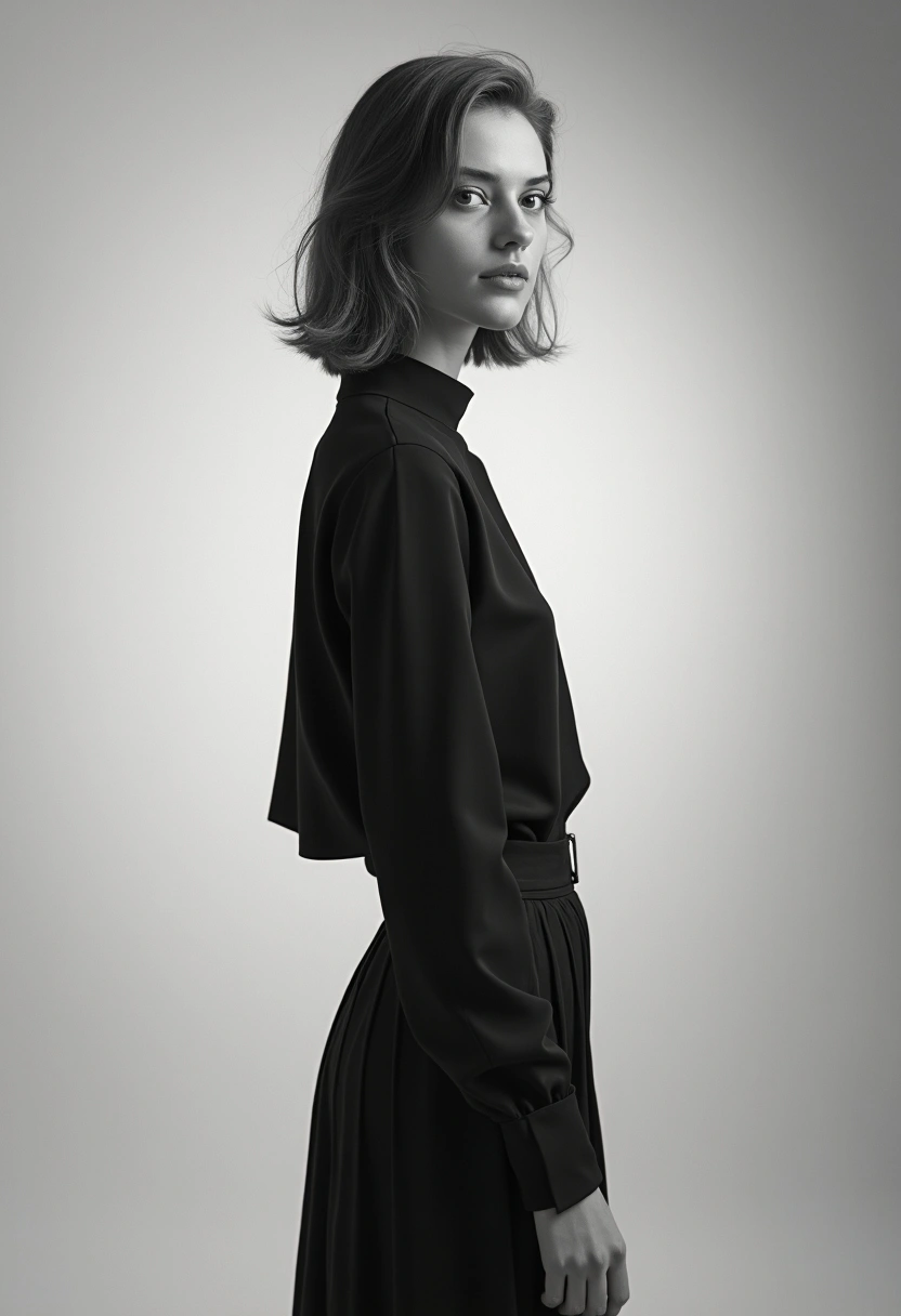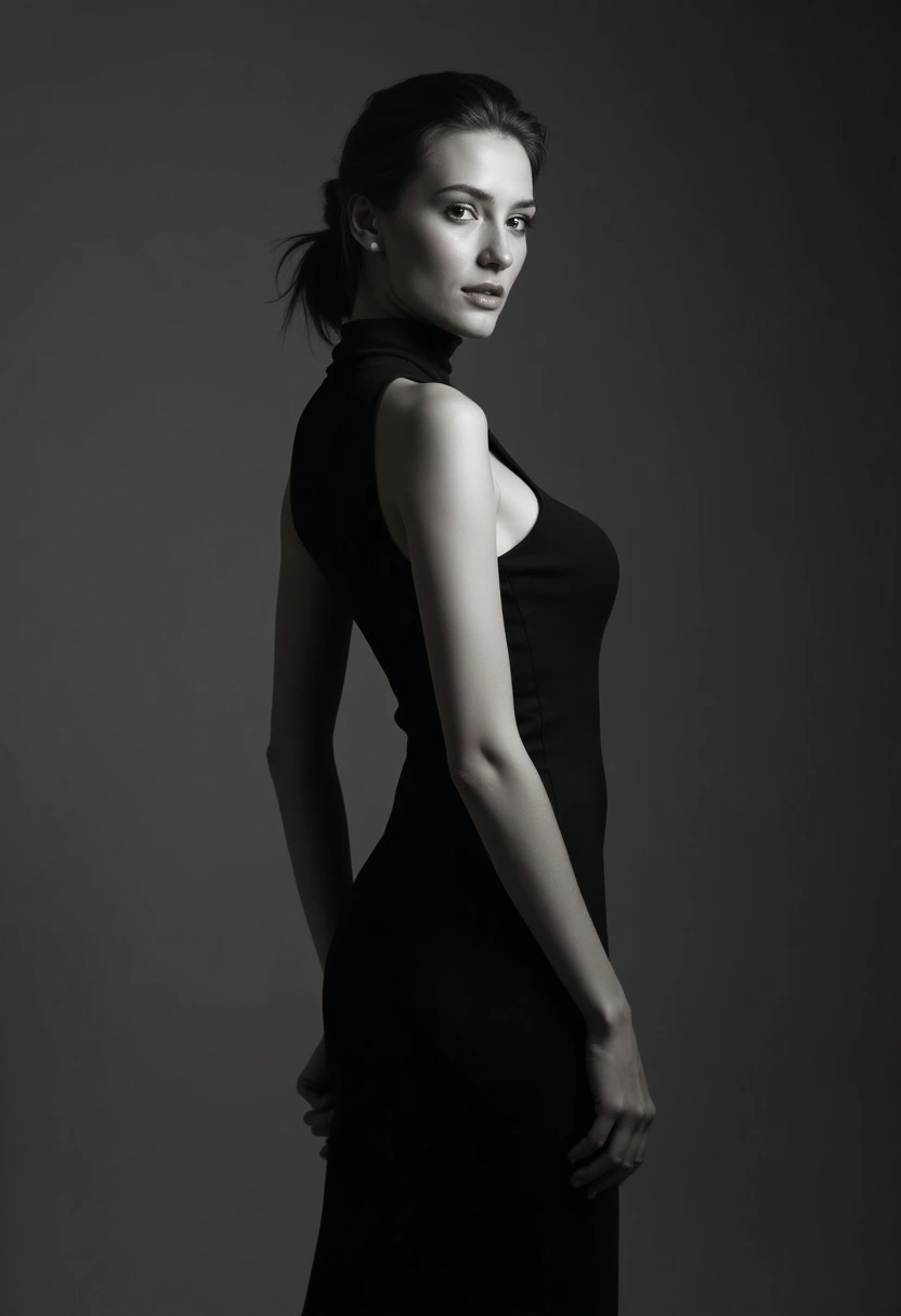 Черно-белая фотография женщины в строгом чёрном платье с высокой горловиной стоит в профиль, поворачивает голову к камере, мягкий студийный свет подчеркивает её черты