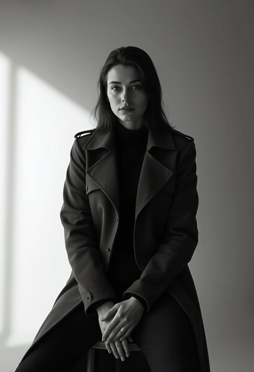 Черно-белая фотография женщины в классическом тренче сидит на высокой табуретке, руки скрещены на коленях, смотрит прямо в камеру, свет подчёркивает линии одежды
