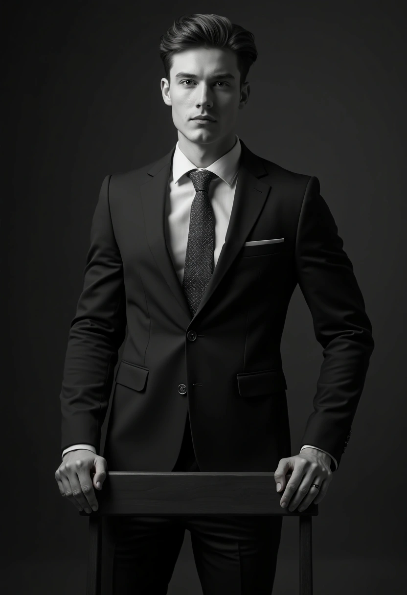 Черно-белая фотография: Мужчина в классическом пиджаке с галстуком стоит у кресла, опираясь на спинку одной рукой, смотрит в камеру, фон глубокий серый
