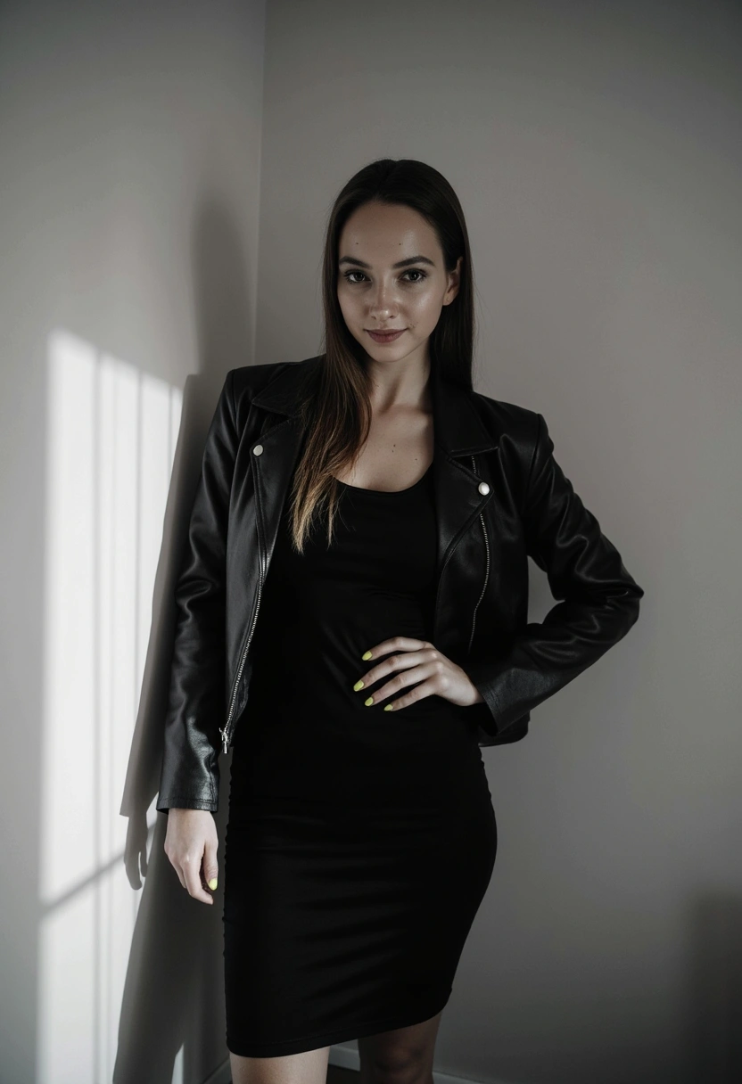 Черно-белая фотография: Женщина в кожаной куртке и облегающем платье стоит у стены с одной рукой на бедре, смотрит прямо в камеру, свет создаёт глубокие тени