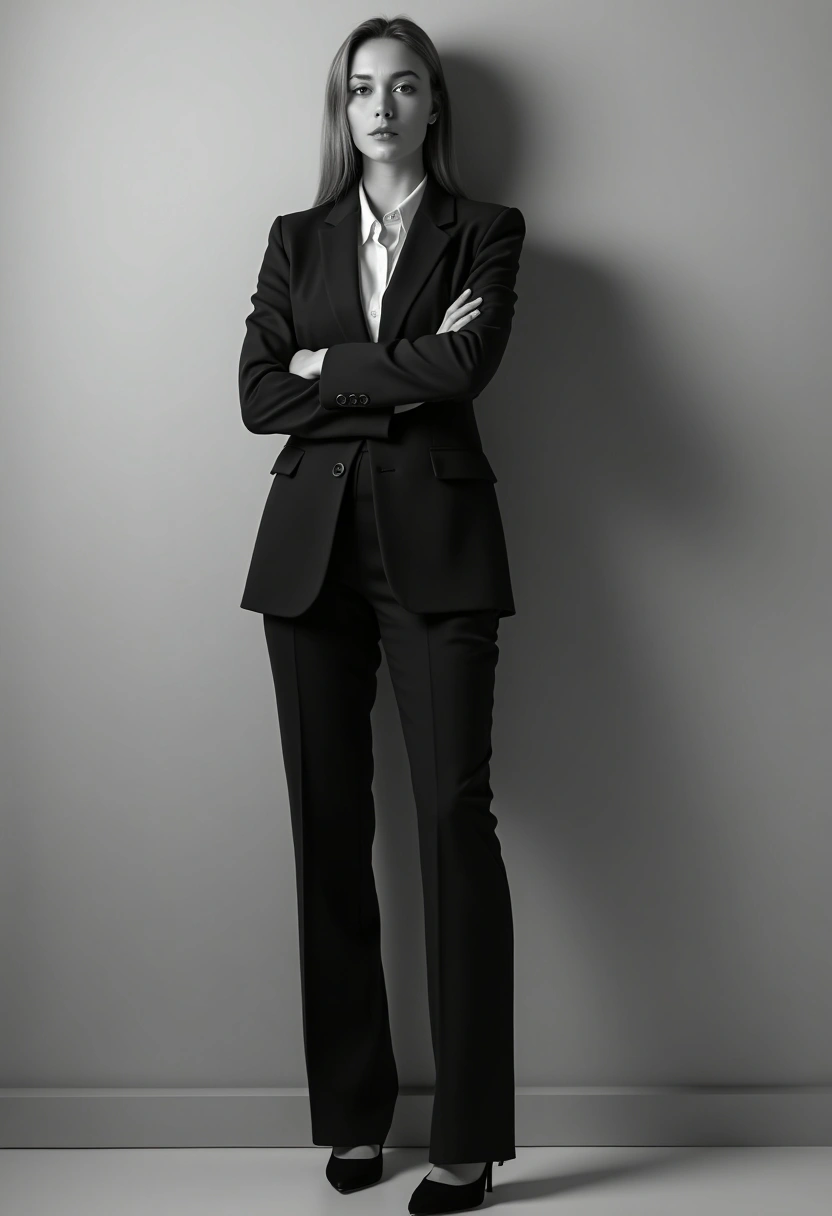 Черно-белая фотография женщины в брючном костюме с серьёзным взглядом стоит у стены, руки скрещены на груди, студийный фон нейтральный