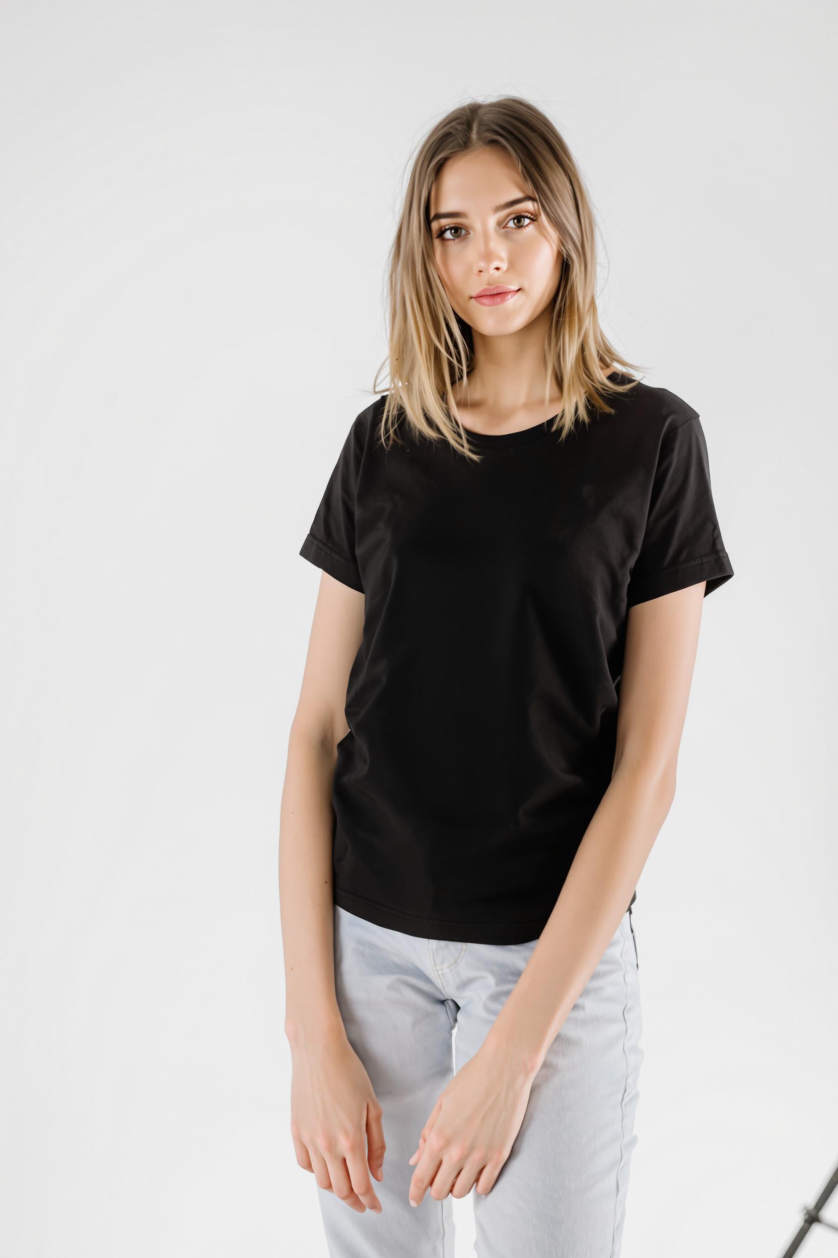 Женщина с распущенными волосами в лаконичной чёрной футболке стоит на белой циклораме, средний план. Её поза естественная, взгляд прямо в камеру, освещение ровное, подчёркивает черты лица, вокруг чистый минимализм студии.