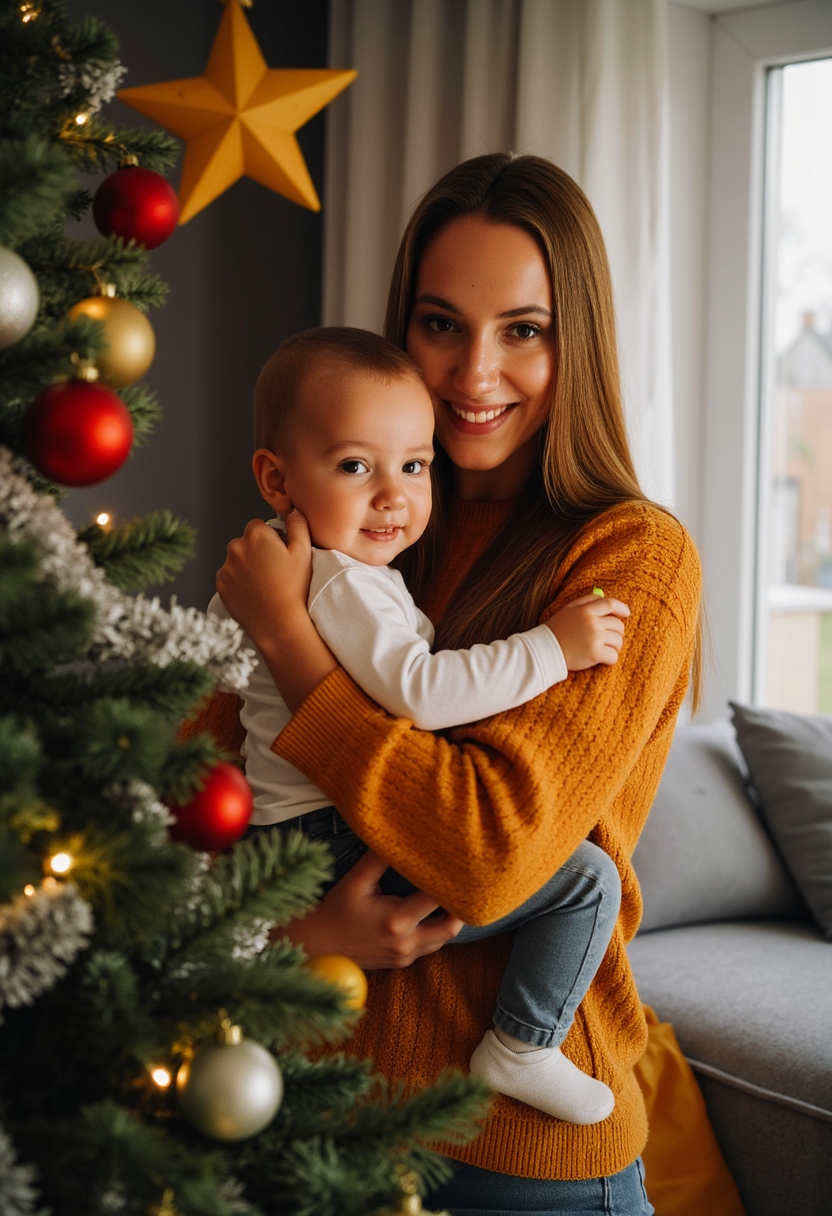 Женщина с ребёнком на руках стоит у наряженной елки, оба улыбаются и смотрят в камеру, вокруг гирлянды и игрушки