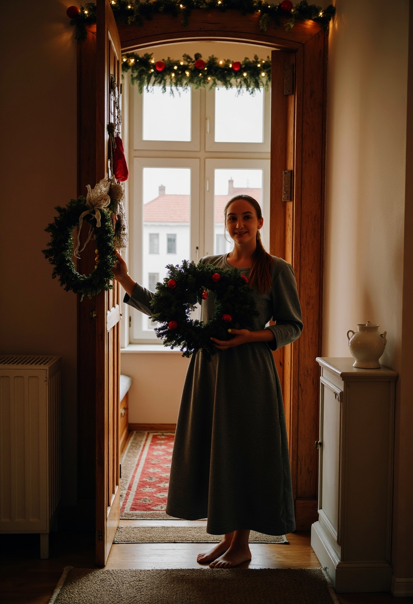 Женщина, с рождественским венком в руках, стоит на пороге своего дома, улыбается в камеру и создает атмосферу тепла и гостеприимства, украшенного гирляндами