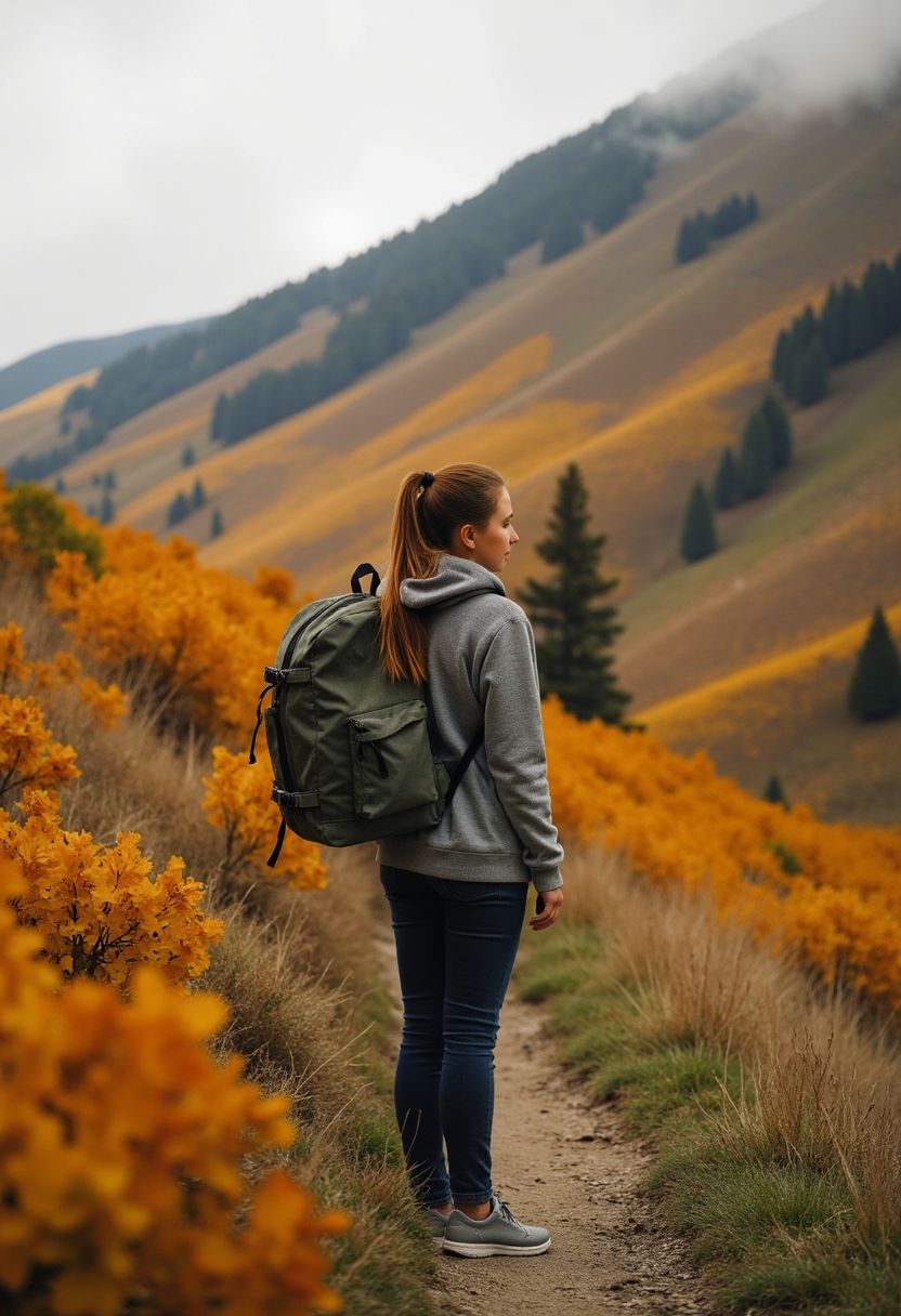 Женщина с рюкзаком стоит у подножия холма с деревьями в золотой листве