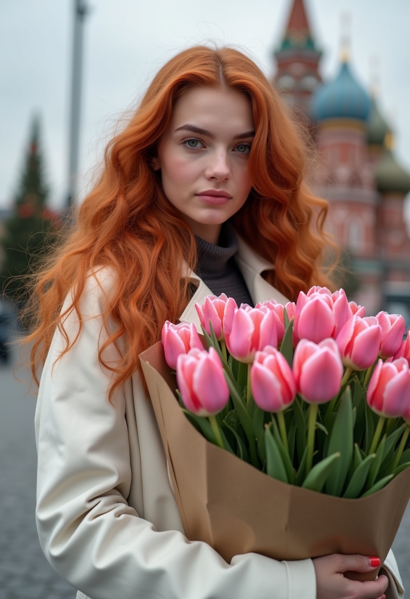 Женщина с рыжми динными волнистыми волосами в белом длинном тренче держит в руках большой букет розовых тюльпанов в крафтовой бумаге. На фоне размытые очертания старинной архитектуры Москвы.