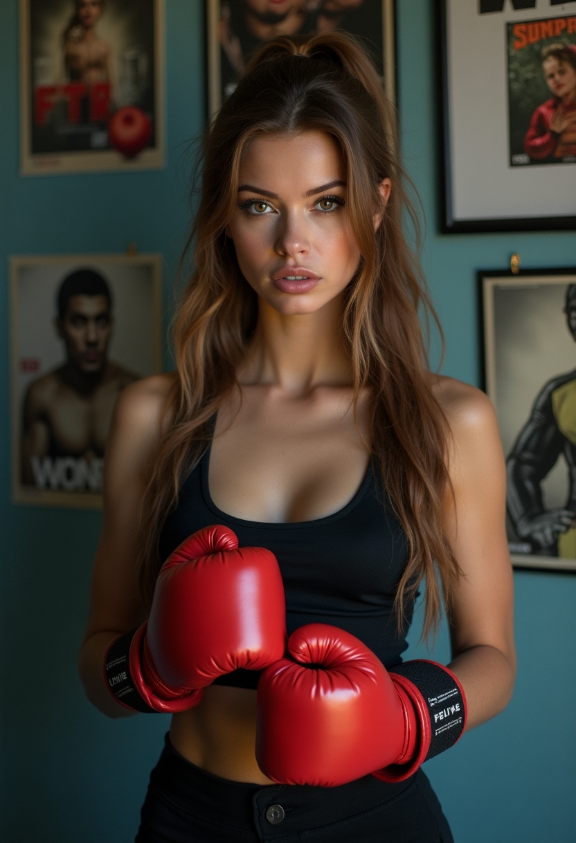 Женщина-боец ММА с высокой прической и длинными серьгами в синих перчатках позирует у зеркала, взгляд в камеру, поза уверенная, свет ярко подчеркивает форму тела. Крупный план.