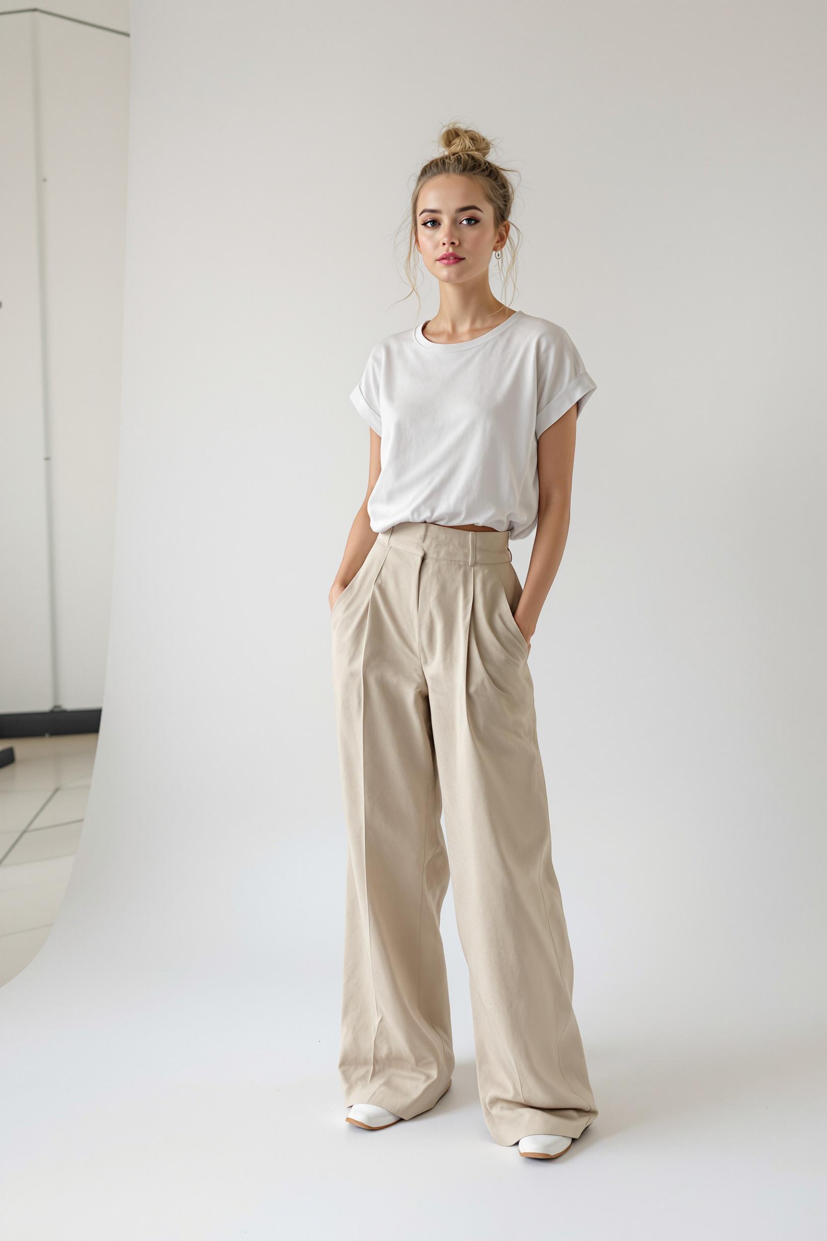 Женщина с собранными волосами одета в лаконичный светлый топ и широкие брюки, стоит в студии на фоне белой циклорамы, средний план, прямой уверенный взгляд в камеру, вокруг чистое минималистичное пространство, мягкий дневной свет.