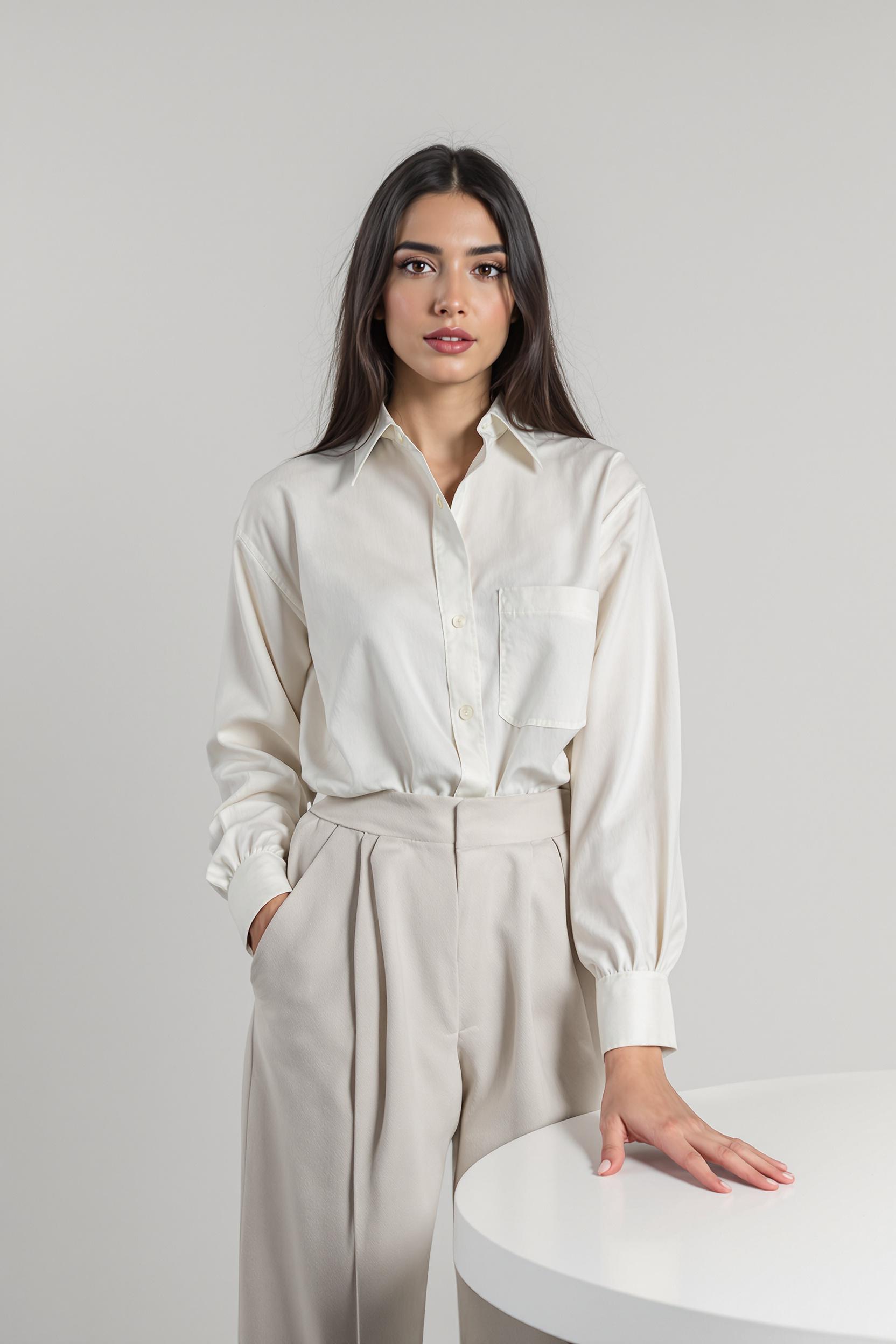 Женщина с тёмными длинными волосами в светлом лаконичном лонгсливе и широких брюках стоит возле простого белого стола на циклораме, ладони свободно лежат на поверхности стола, корпус немного подан вперёд, уверенный взгляд прямо в камеру, чистый минимализм, мягкое ровное студийное освещение.