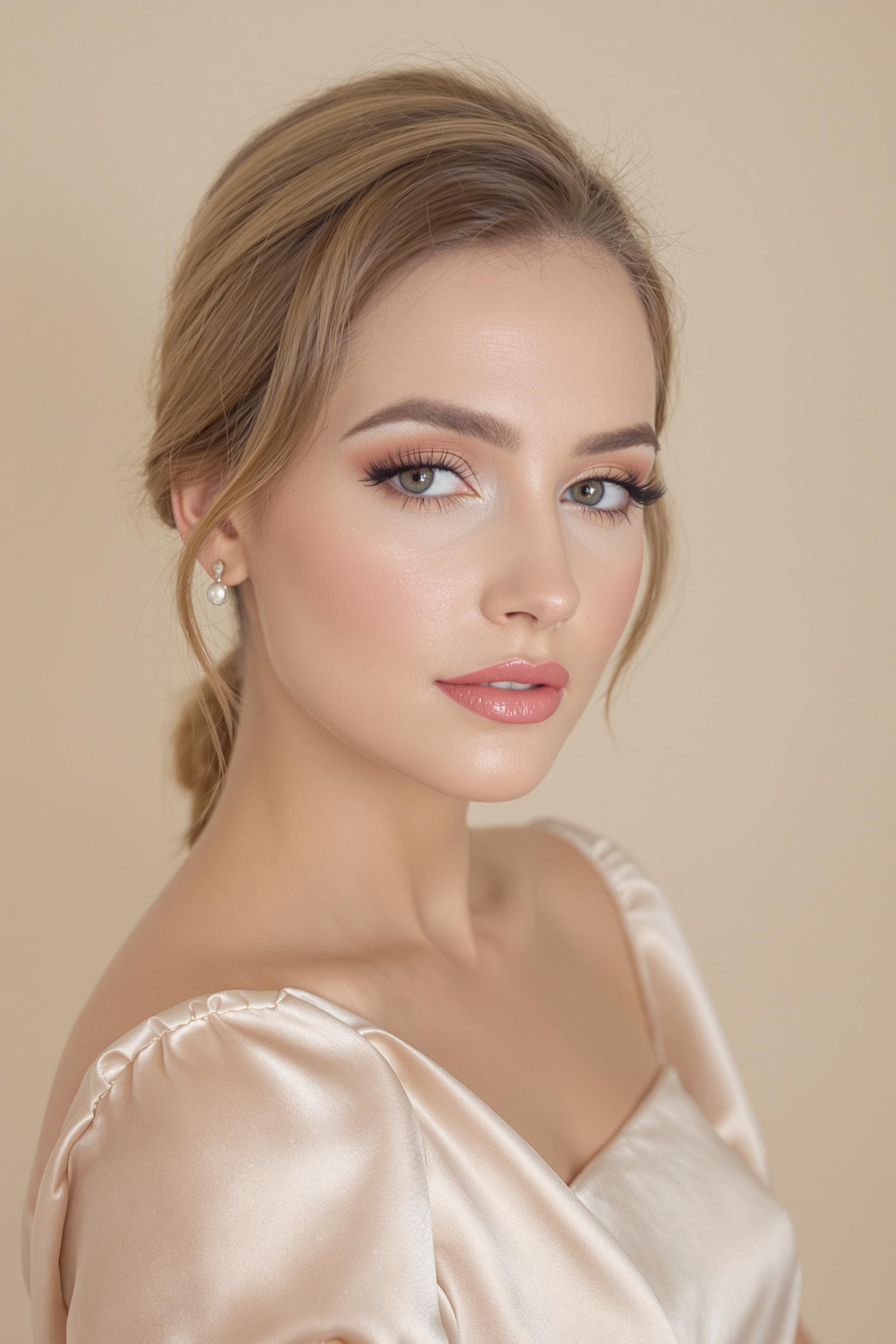 Женщина с утончённым свадебным макияжем: кожа жемчужного сияния, еле заметный контуринг, глаза подчеркнуты персиково-розовыми тенями и короткими накладными ресницами, губы — перламутрово-розовые. Бежевый атласный топ, гладко уложенные волосы, крупный план, прямой взгляд, фон — светлая бежевая циклорама.