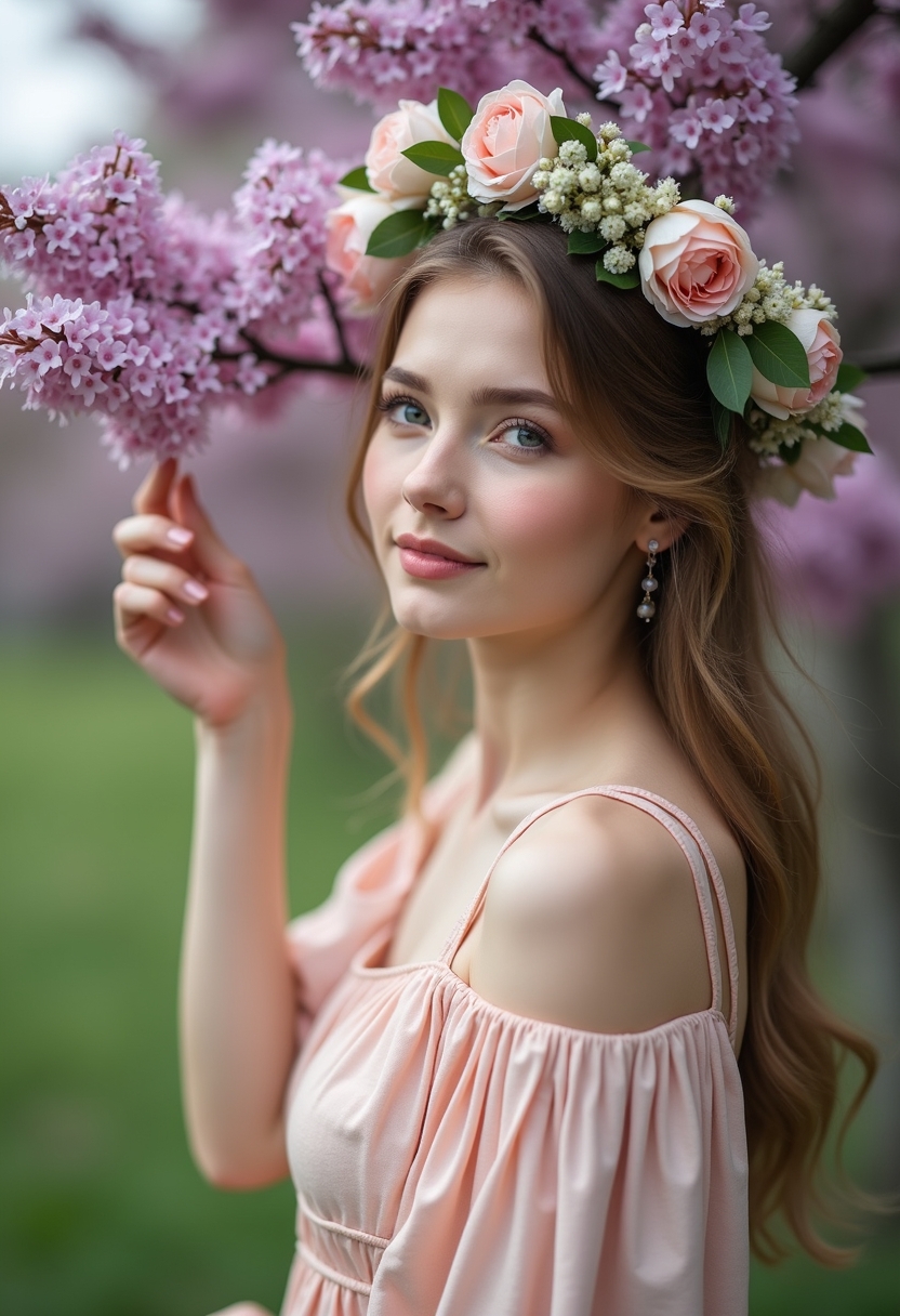Женщина с венком из весенних цветов на голове стоит возле цветущей сирени, слегка касаясь ветвей. Она смотрит в сторону с мечтательным выражением лица. На ней лёгкое платье пастельных тонов. Крупный план.