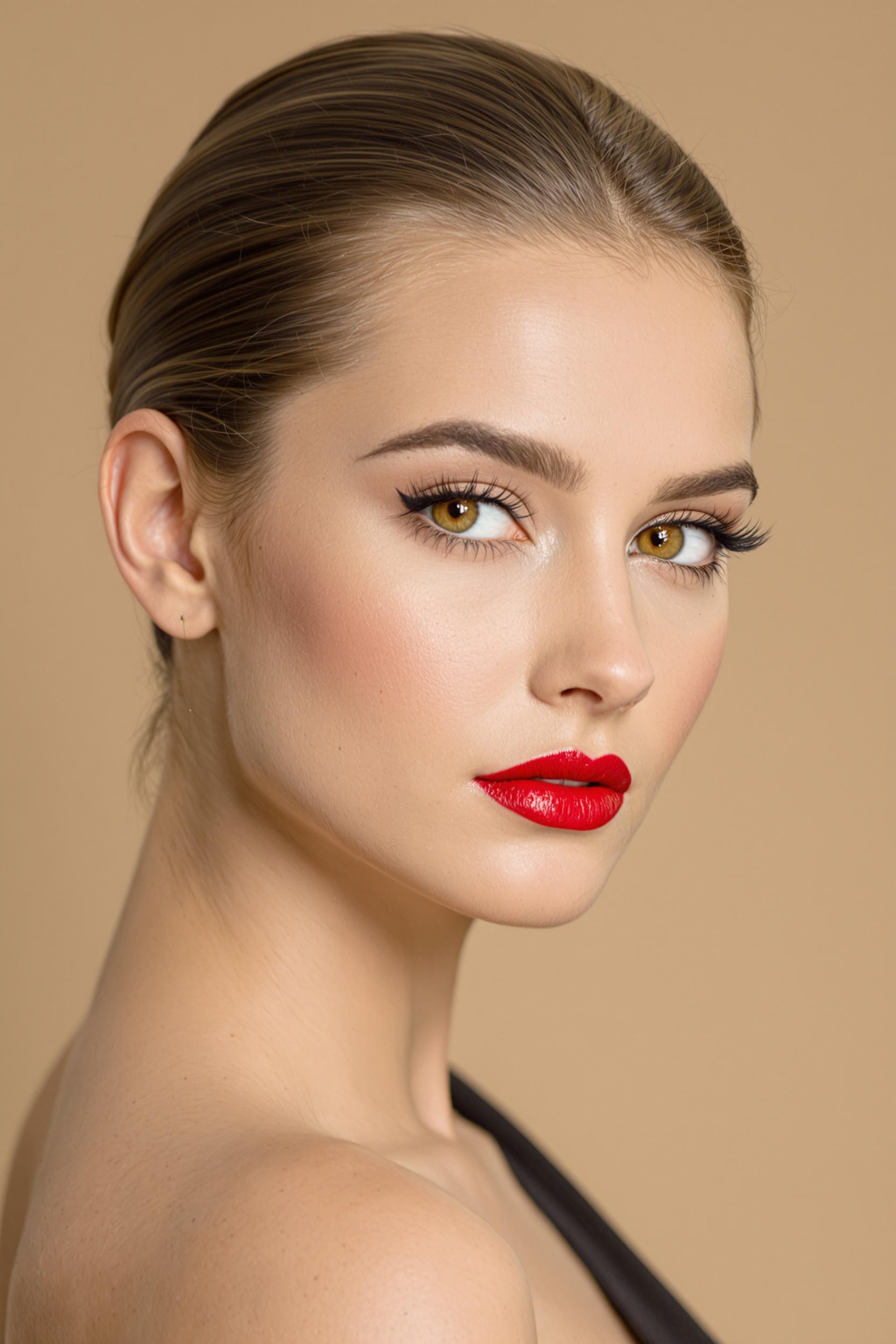 Женщина с выразительно выделенными скулами и безупречно ровной кожей, акцент на глазах с элегантными стрелками и густыми ресницами. Яркая ало-красная помада, волосы гладко зачёсаны назад. Крупный план, уверенный взгляд в камеру, бежевая циклорама на заднем плане.