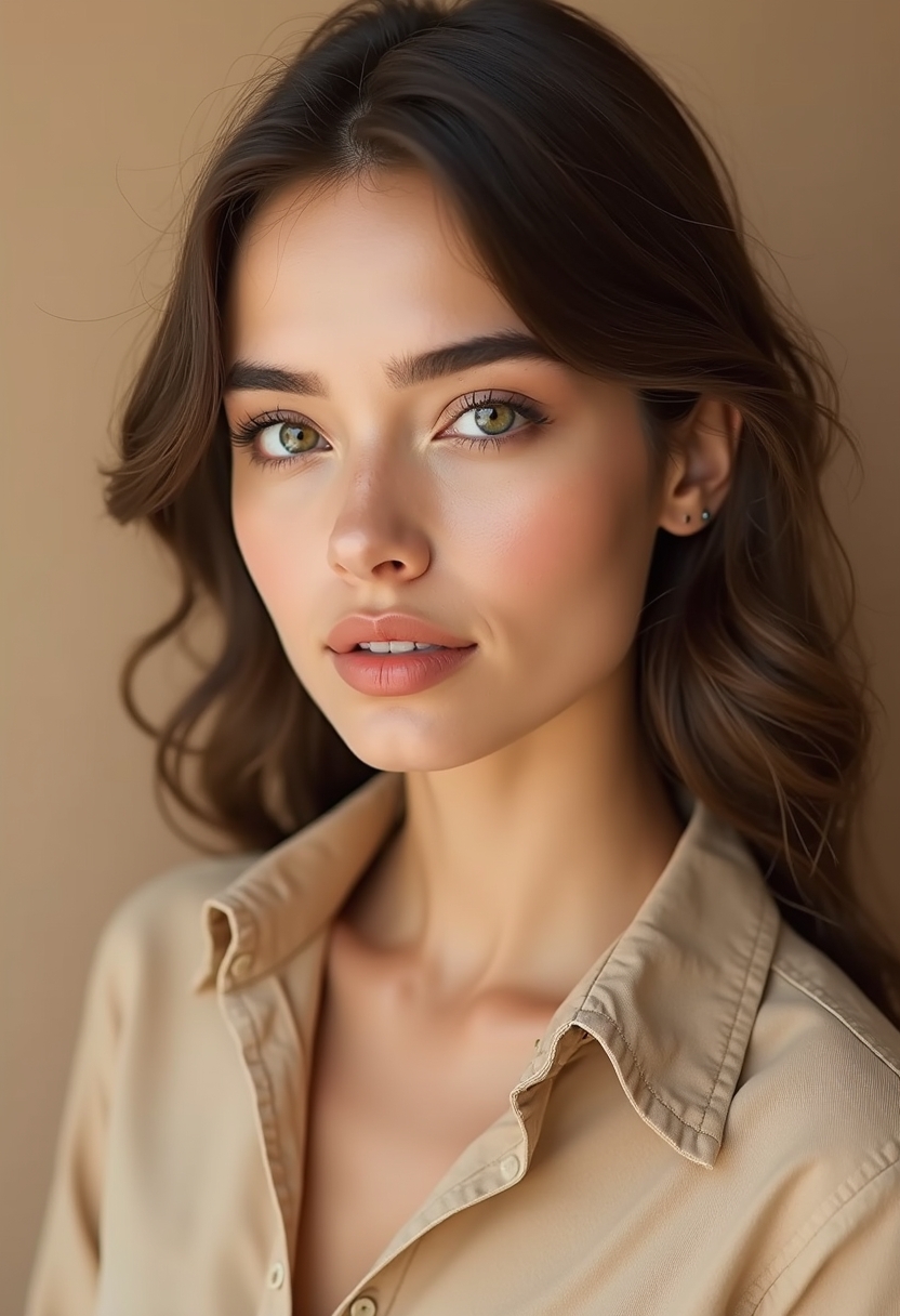 Женщина с выразительным контуром лица, губами насыщенного бежевого оттенка и идеально ровной кожей. Макияж глаз лаконичный, стрелки тонкие, идеально ровные. Одета в лёгкую рубашку песочного цвета. Бежевая циклорама мягко сливается с палитрой её макияжа.