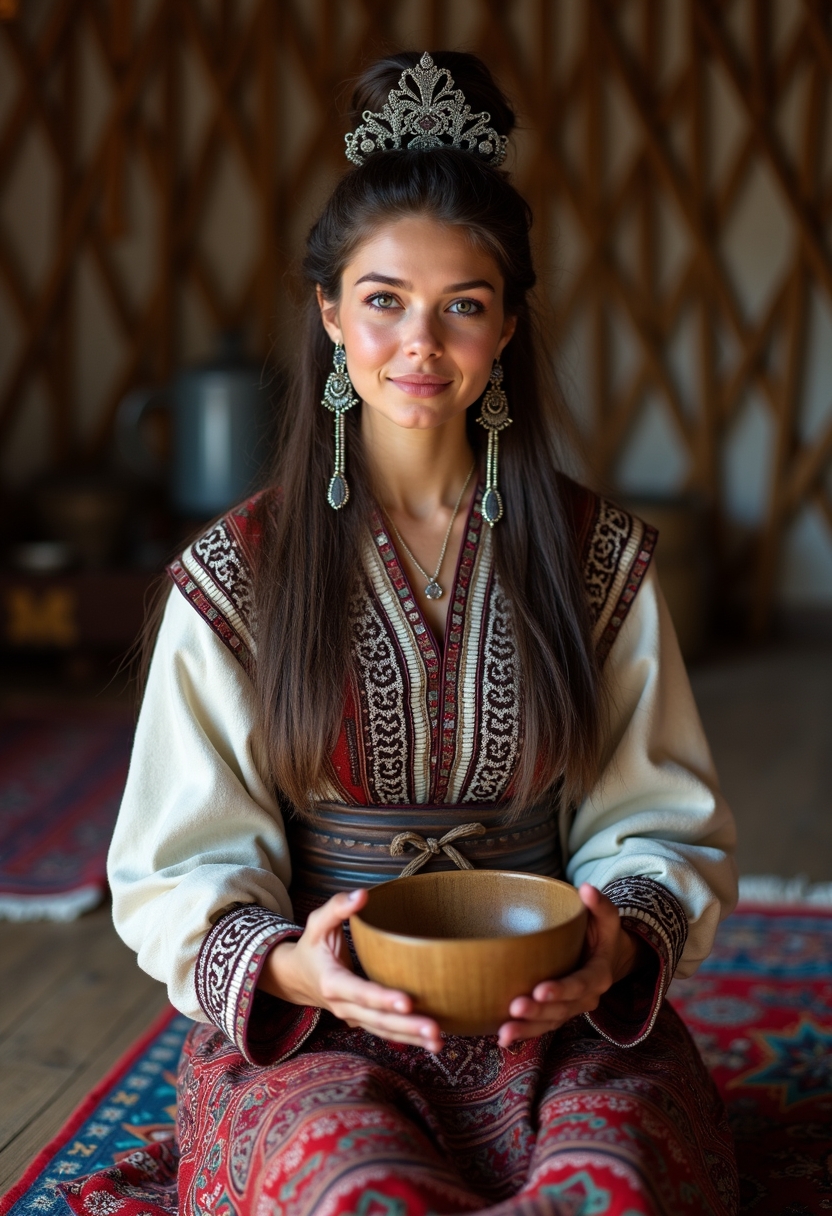 Женщина с высокой бурятской причёской, украшенной серебром, сидит на ковре в юрте, держит в руках деревянную чашу. Позади традиционный интерьер с коврами и утварью. Крупный план, акцент на атмосфере быта.