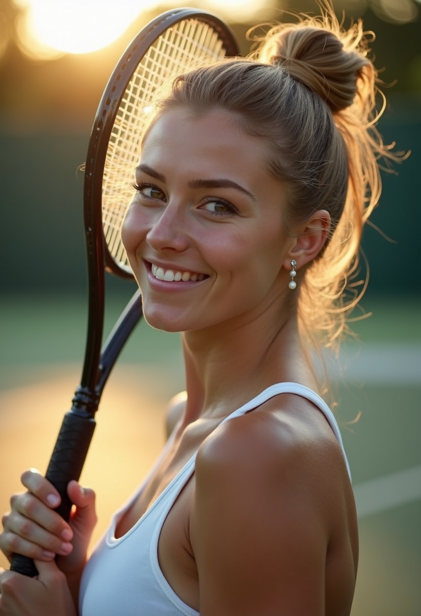 Женщина с высокой причёской держит в руках теннисную ракетку, её пальцы обхватывают ручку с силой. Её губы приоткрыты, а на лице уверенная улыбка. Позади солнечный свет отражается от покрытия корта. Крупный план, акцент на деталях формы и настрое спортсменки.