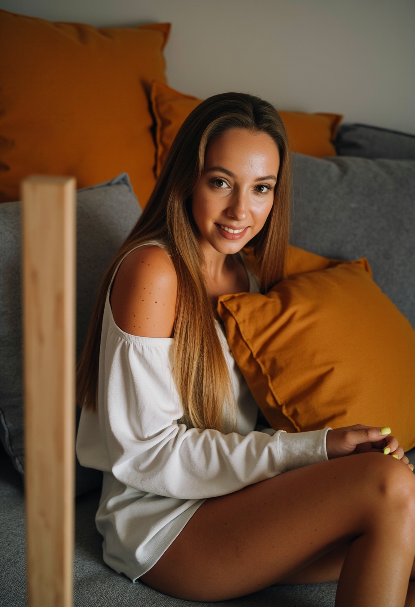 Женщина с ярким макияжем делает селфи в зеркале своей спальни, окружённой декоративными подушками и тёплым светом